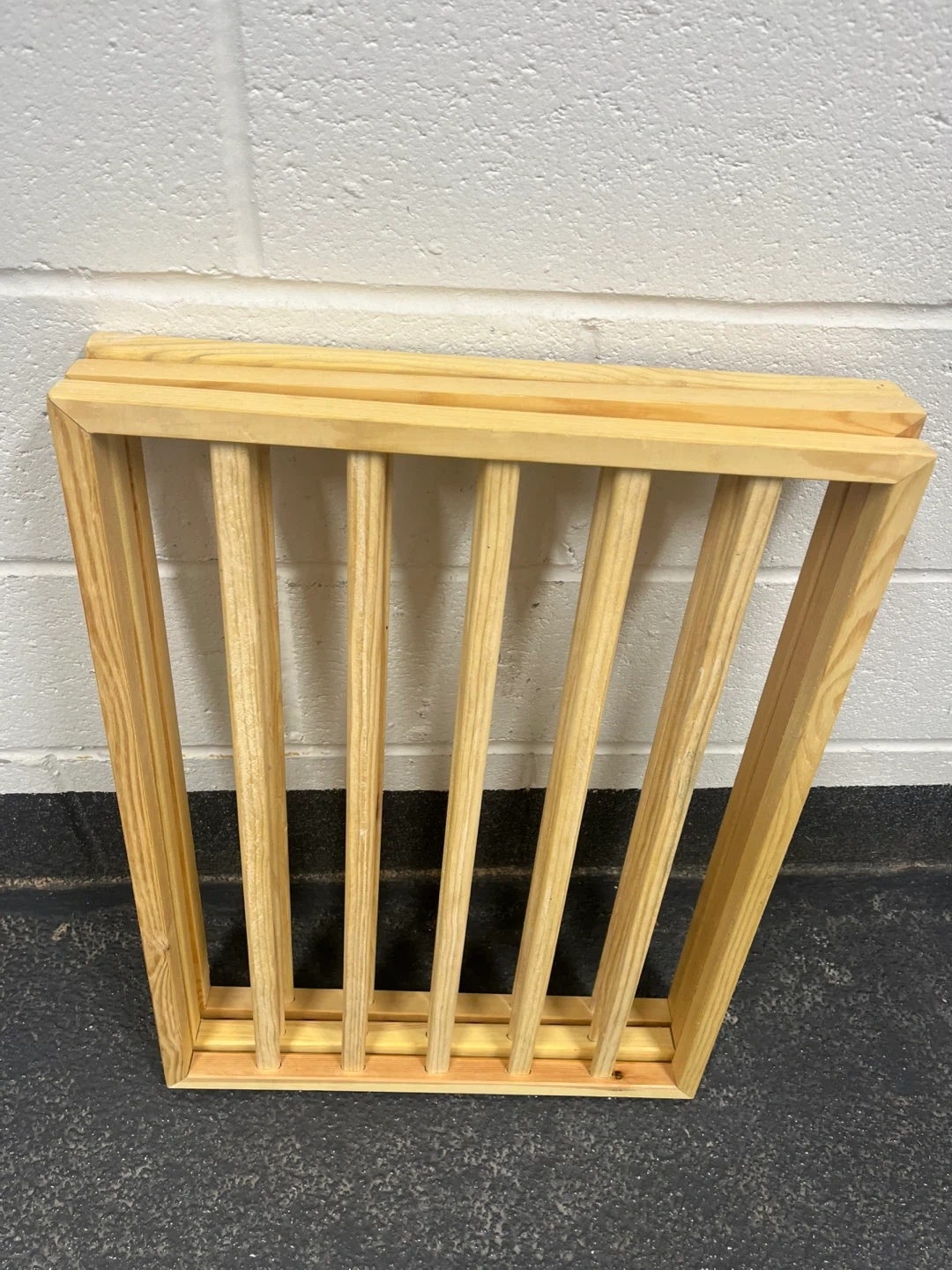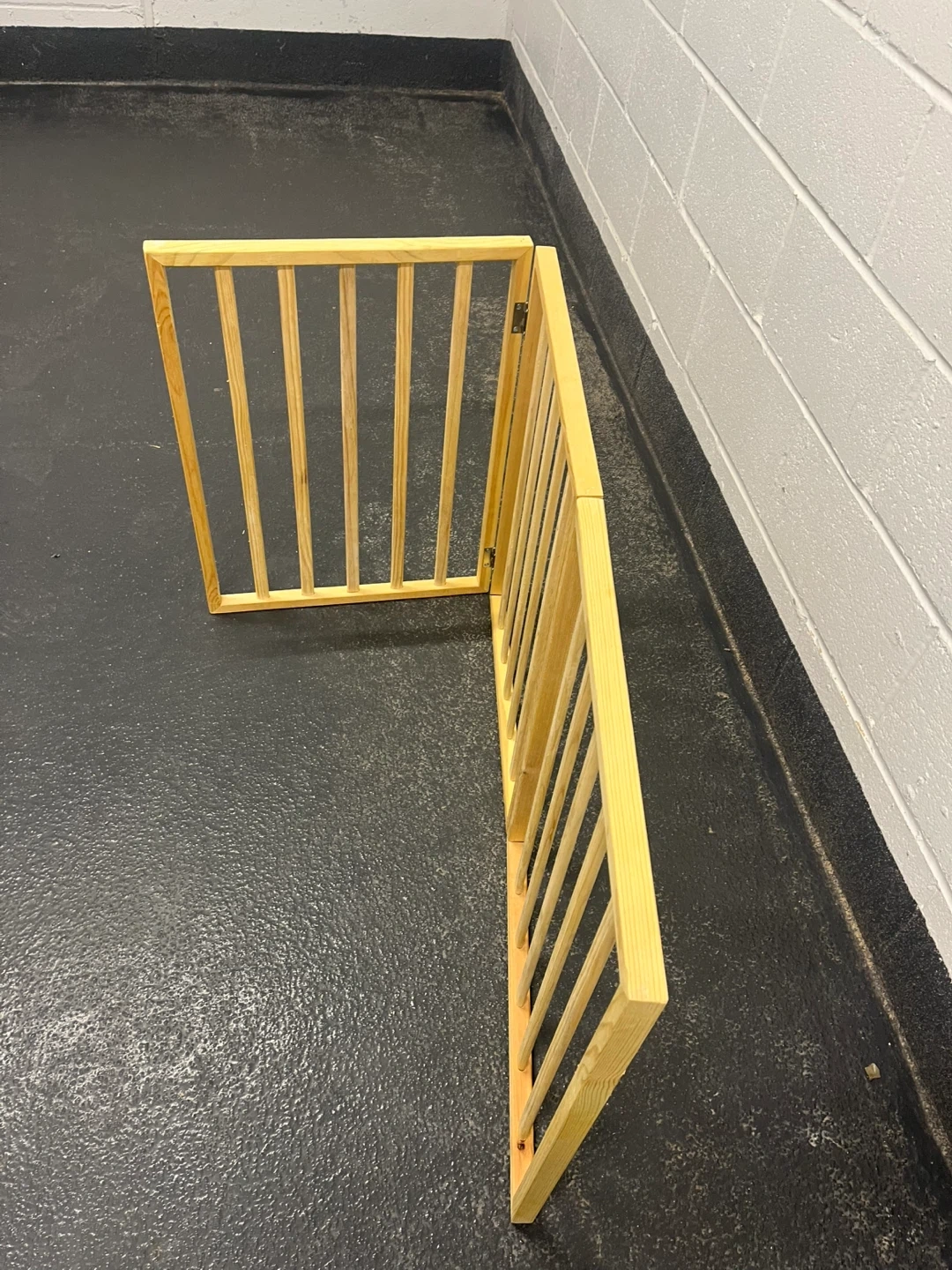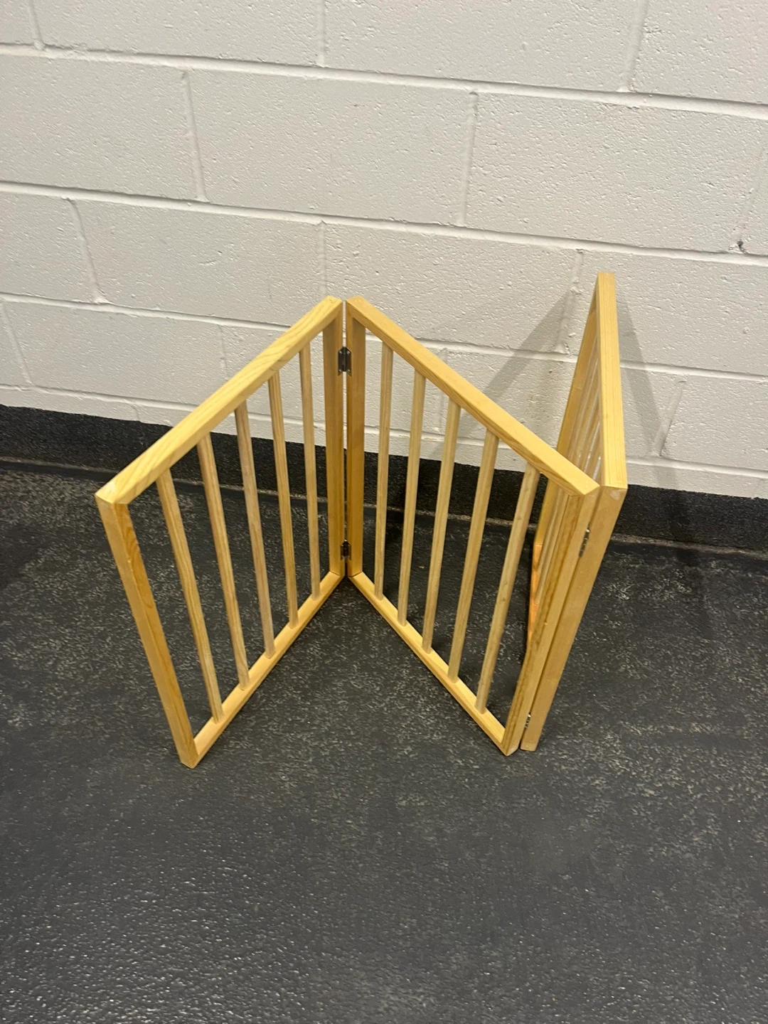 A three-panel wooden pet gate made of pine. It's freestanding and can be configured in various ways. Great for keeping pets contained in specific areas!