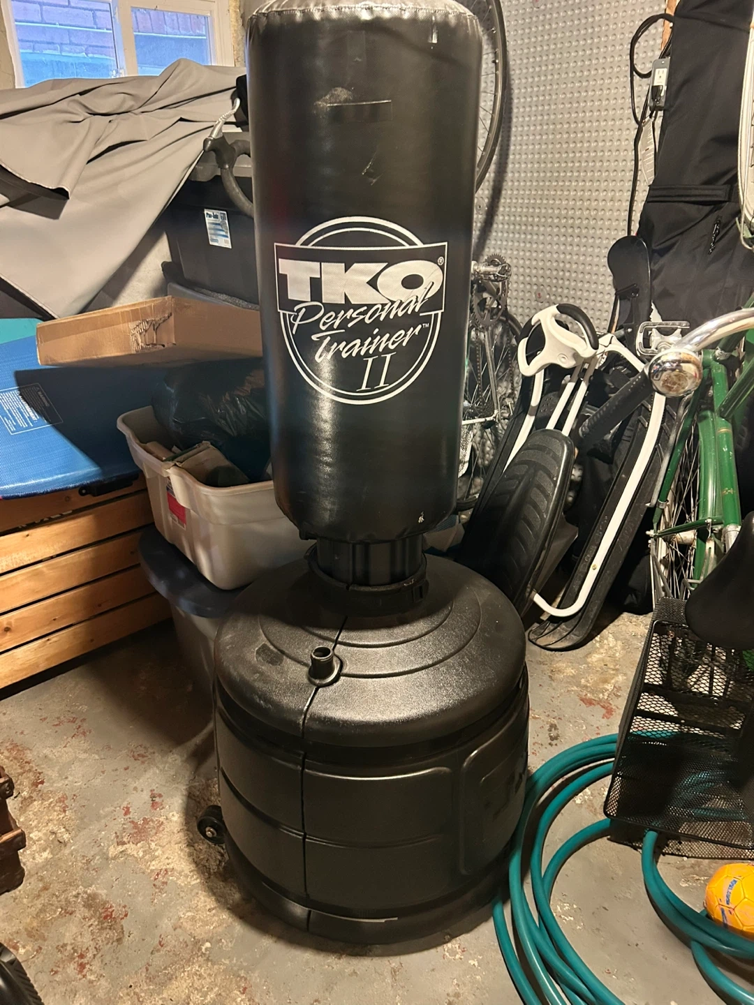 TKO Personal Trainer II free-standing punching bag. It's black and made of durable material. The base has wheels for easier moving. Filled with sand base. Priced low to sell quick.