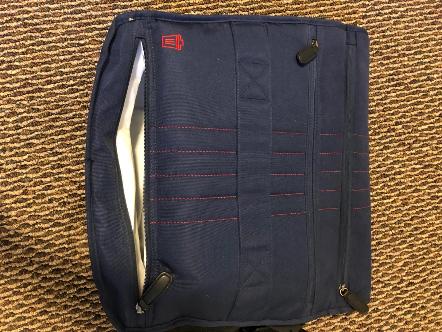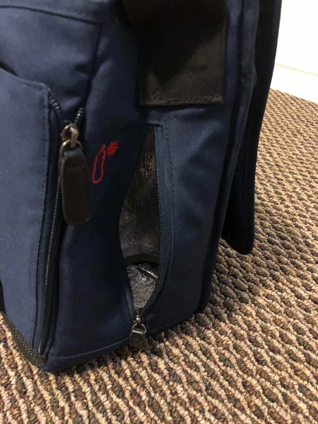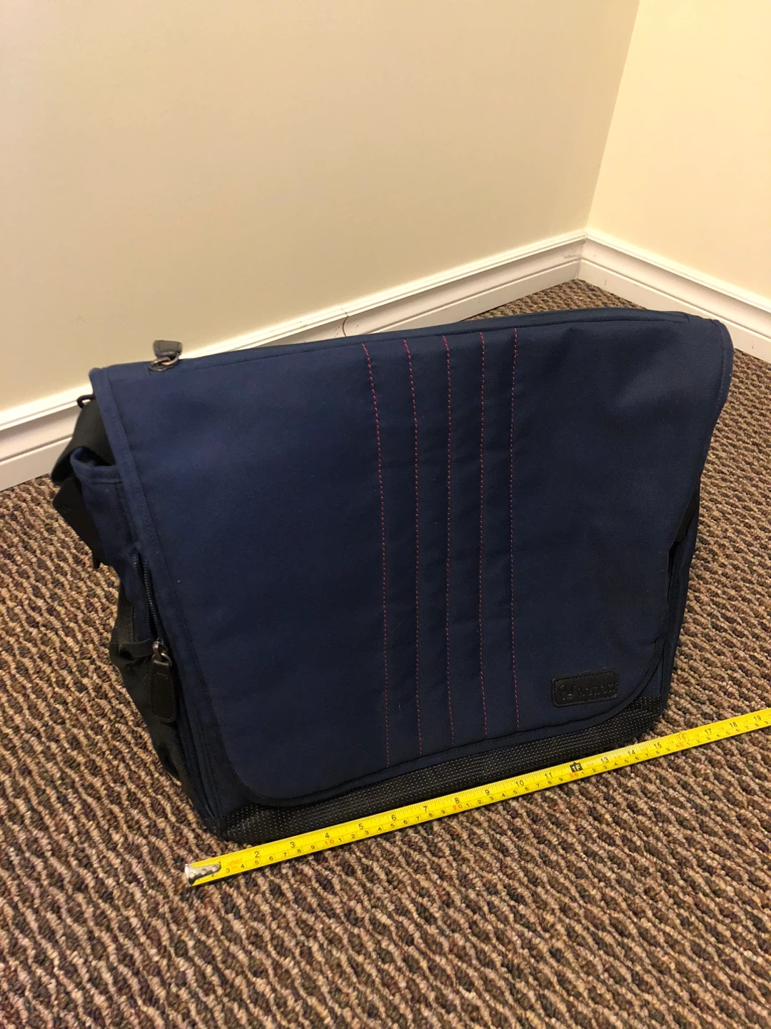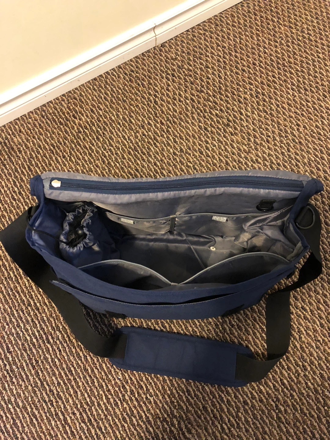 Spacious diaper bag in a nice navy blue colour. It features multiple interior pockets for organization and a changing pad. The adjustable shoulder strap makes it comfy to carry.