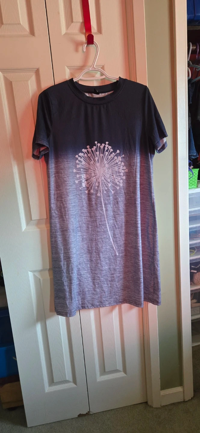 Bought for an event and got the wrong size. This comfy t-shirt dress features an ombre design from dark navy to light grey. It has a large white dandelion graphic on the front. The material is soft and breathable.