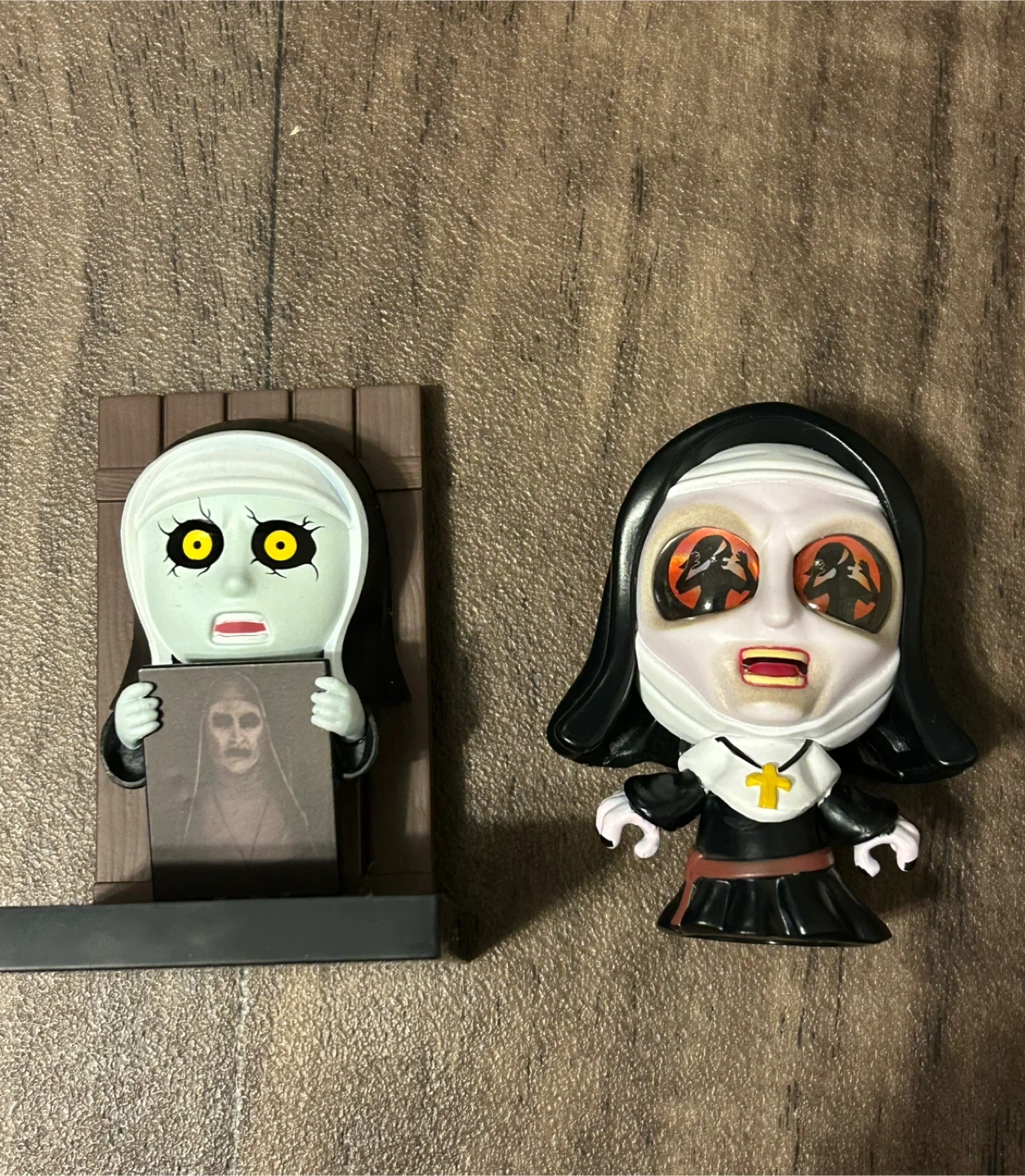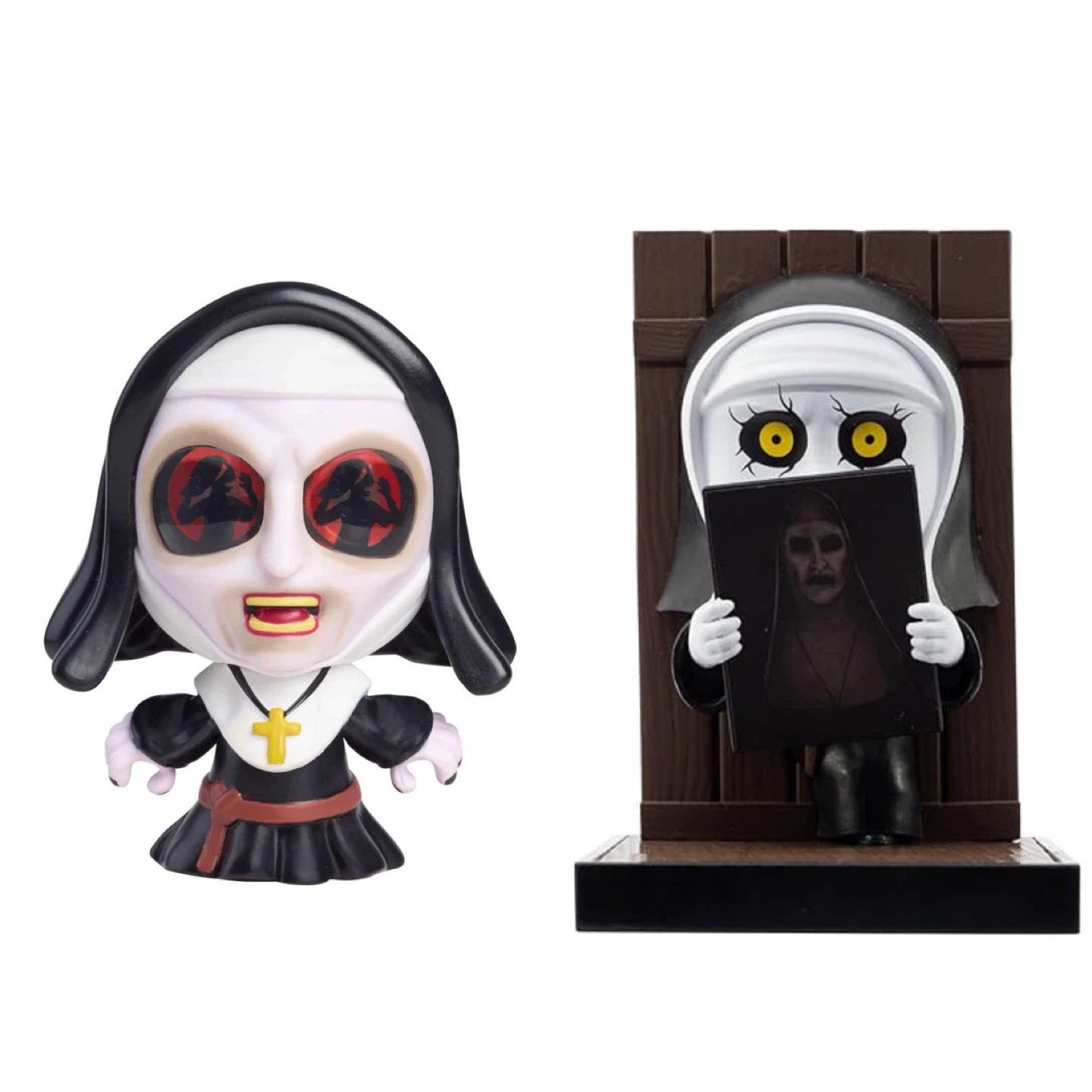 This set includes two figures inspired by the horror character The Nun. One figure is a standalone collectible, while the other comes with a wooden door diorama accessory. These figures capture the iconic look of the terrifying character.