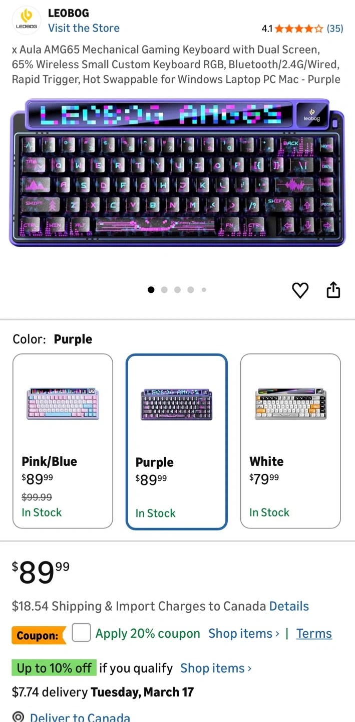 This is a LEOBOG AMG65 mechanical keyboard in purple. It features a dual screen and RGB backlighting. It's a 65% wireless keyboard supporting Bluetooth, 2.4G, and wired connections. It's hot-swappable and suitable for Windows, Mac, and Linux. Includes original box and accessories.
