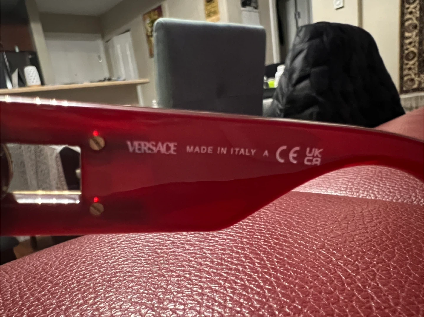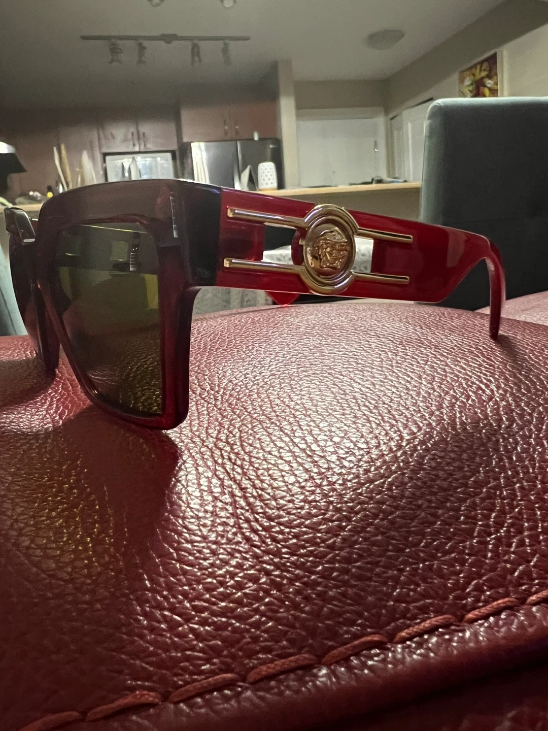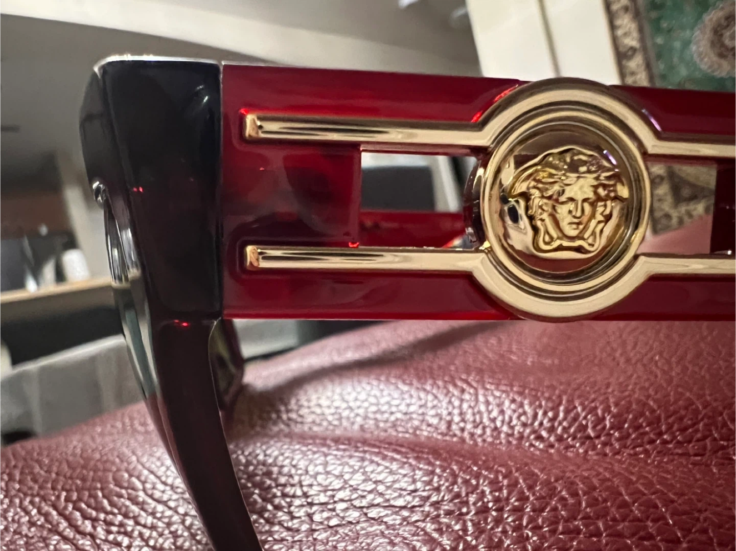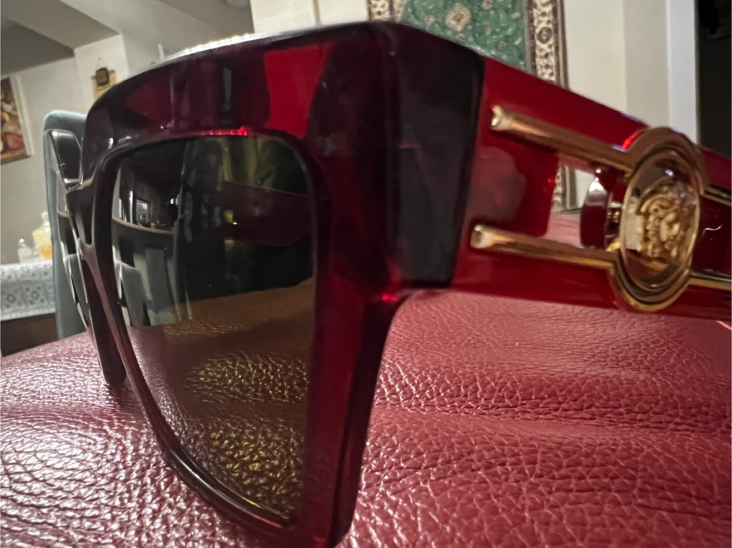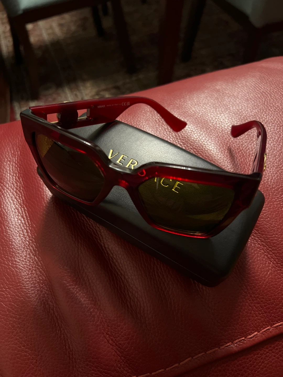 These Versace sunglasses boast a bold, angular design in a deep burgundy color. They feature the iconic Medusa head emblem on the gold-toned accents at the temples. The lenses are tinted for eye protection. Coming with original case.