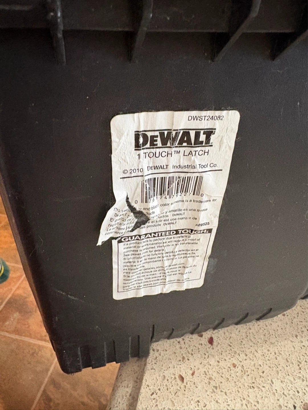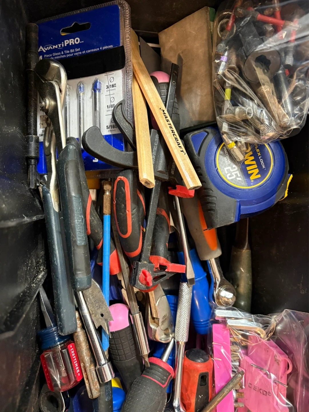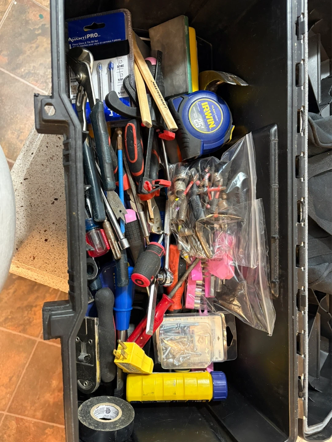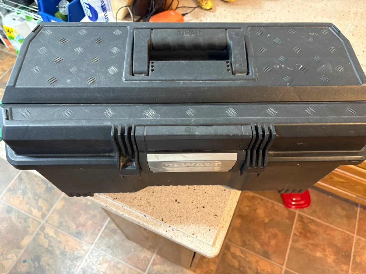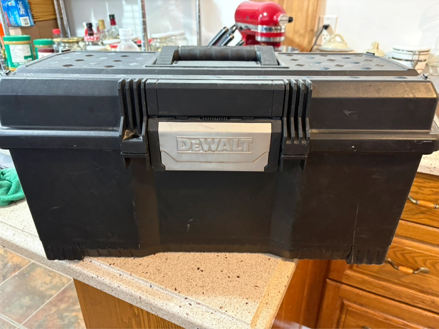 Black DEWALT toolbox filled with various hand tools. Includes screwdrivers, pliers, a tape measure, hammer, small level, bits, 2 Irwin clamps, hacksaw, saw with metal blade, knives and more. Great for DIY projects or professional use!