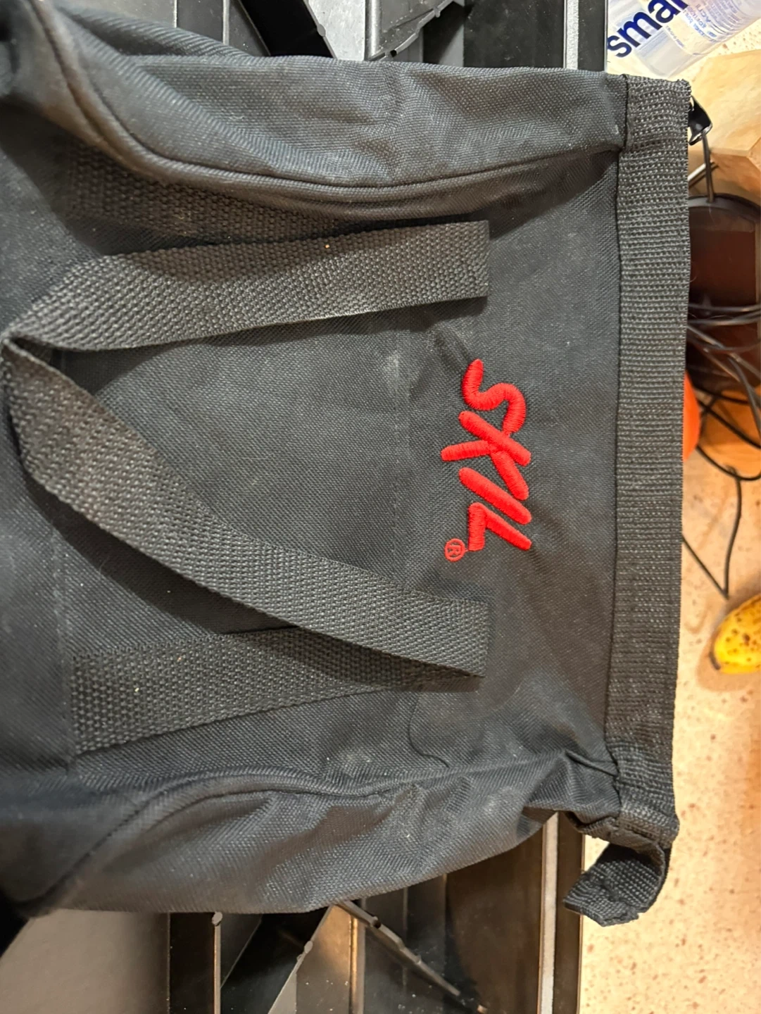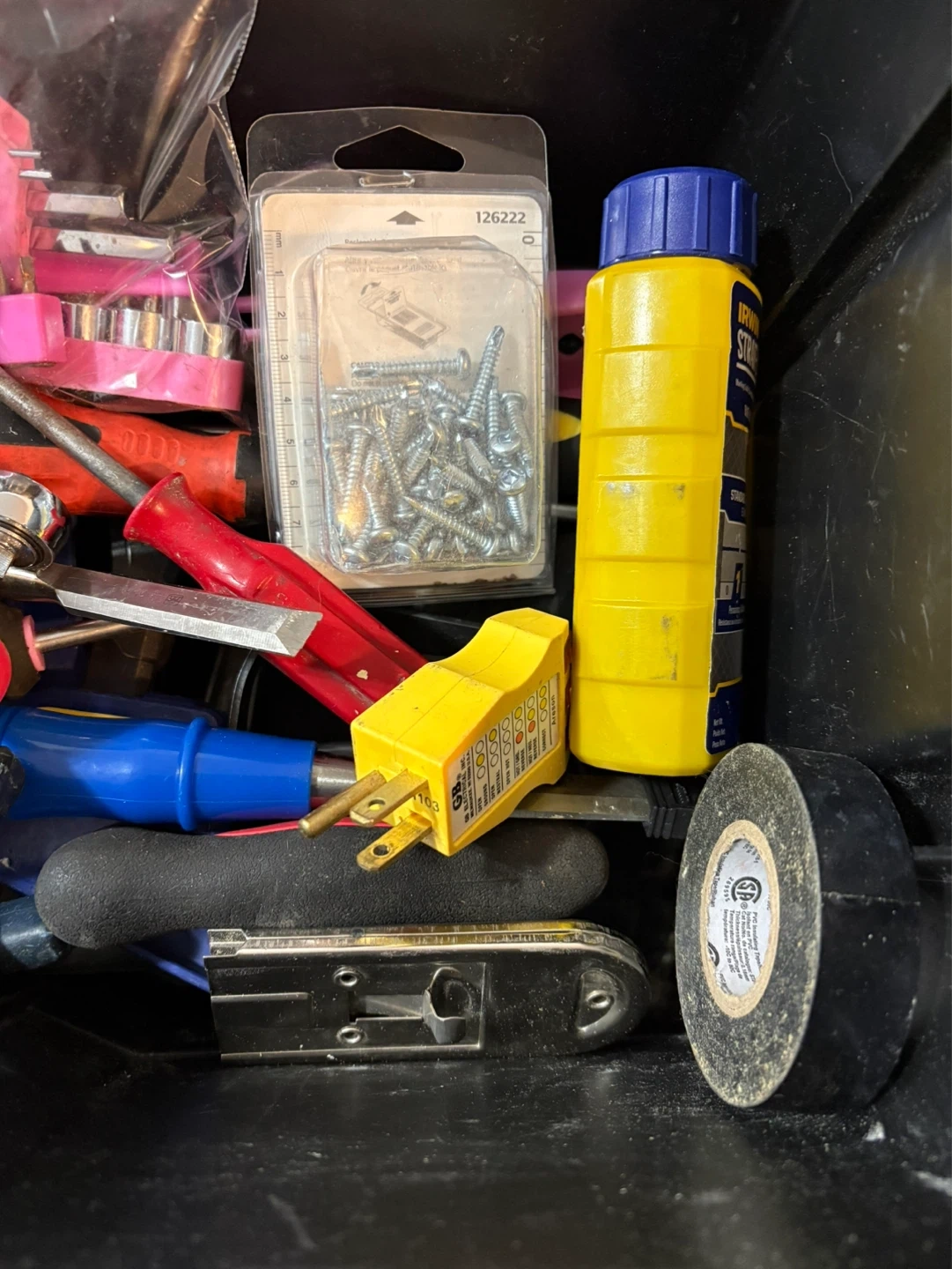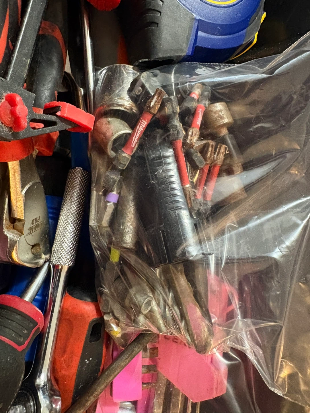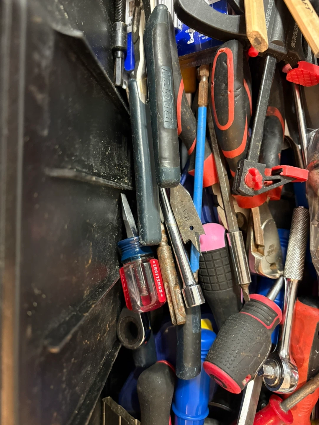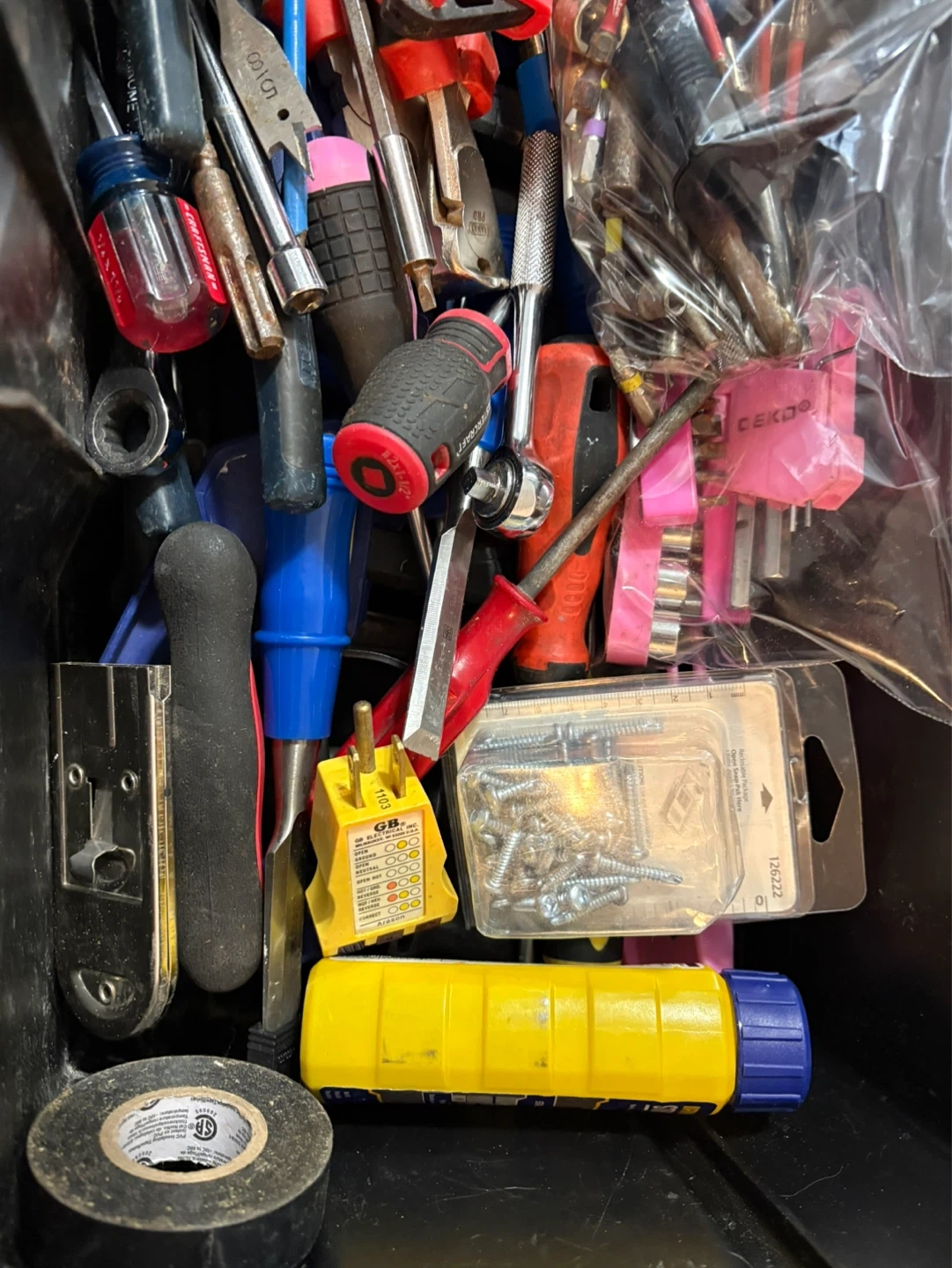 Black DEWALT toolbox filled with various hand tools. Includes screwdrivers, pliers, a tape measure, hammer, small level, bits, 2 Irwin clamps, hacksaw, saw with metal blade, knives and more. Great for DIY projects or professional use!