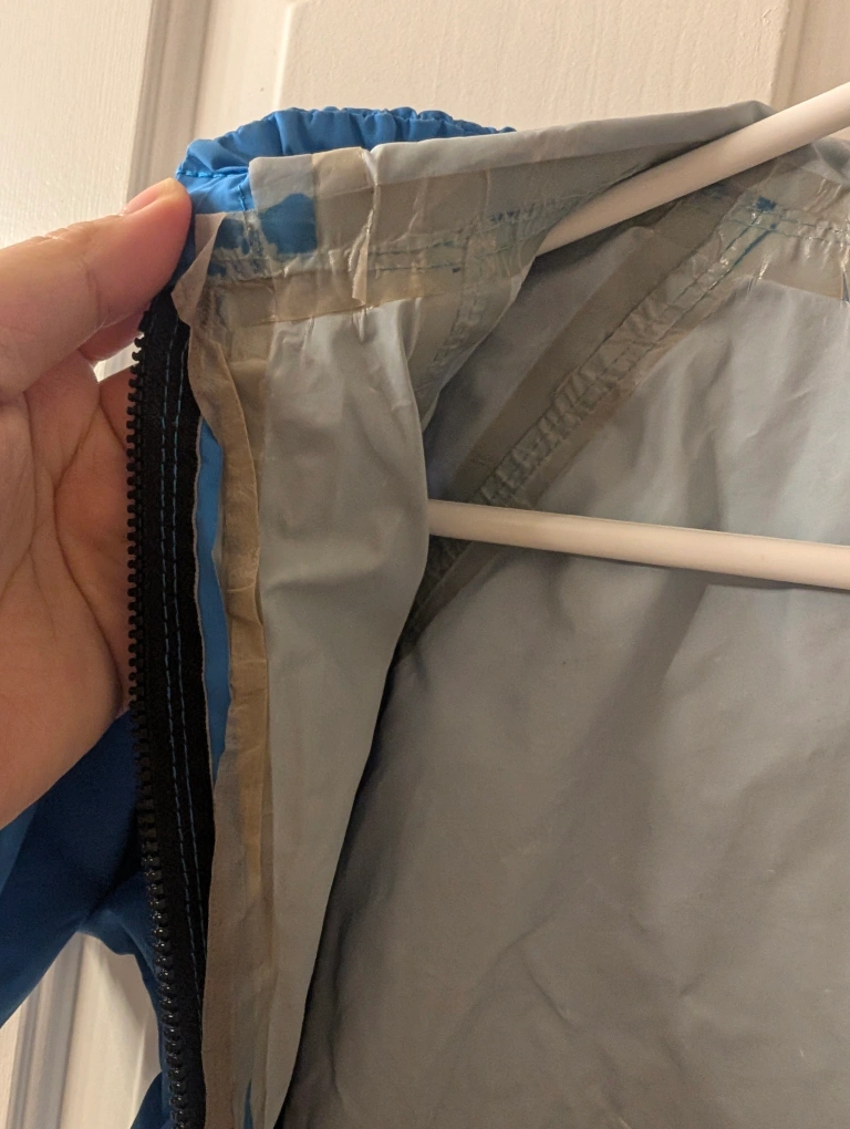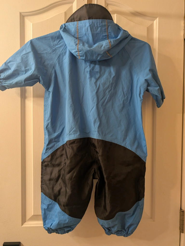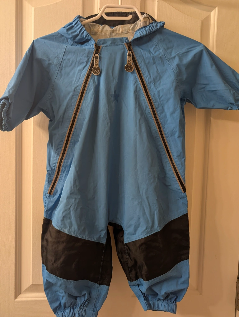 Here's a Callikids rain suit in size 18M! It's blue and black, perfect for keeping your little one dry on those rainy days. It has a hood and zips up the front.