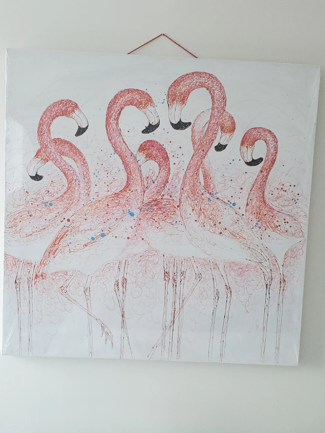 Canvas print featuring a whimsical flock of flamingos with seqins eyes. The artwork has a sketched look with subtle pink and blue splatters. It's ready to hang for a pop of colour!