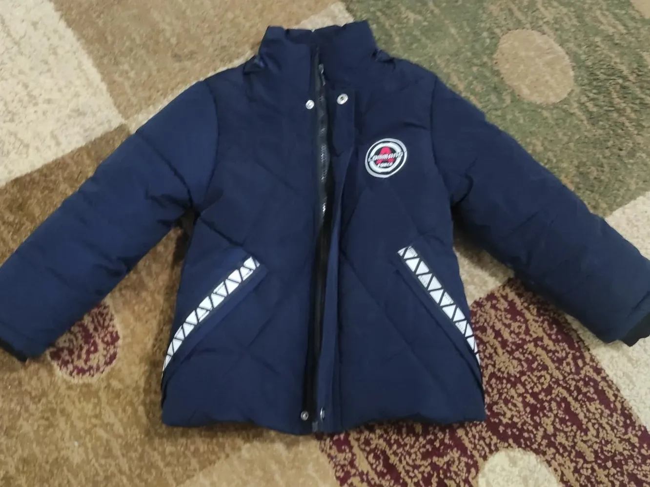Here's a navy blue padded jacket for kids! It has a cool design on the chest and some geometric detailing on the pockets. It's in great condition and ready for a new adventure!