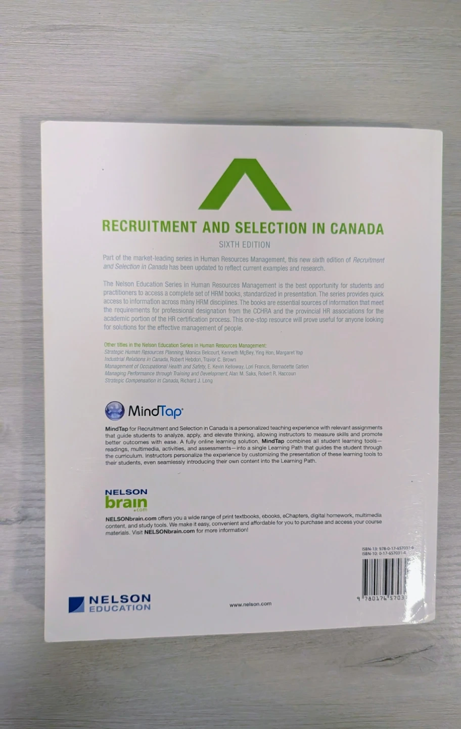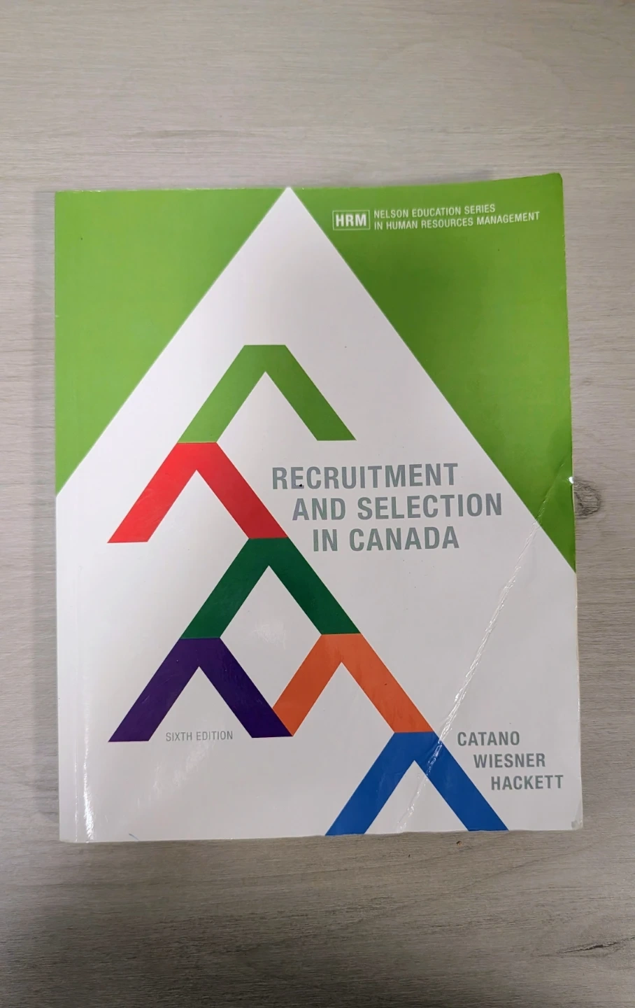 Textbook for Recruitment and Selection in Canada, published by Nelson Education. This is the sixth edition. Authors are Catano, Wiesner, and Hackett.