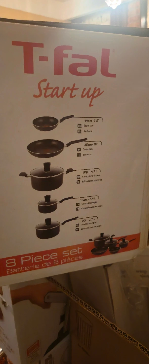 This T-fal Start Up set includes an 8-piece cookware collection. It features a 19cm sauté pan, a 25cm sauté pan, a 4.7L covered dutch oven, a 1.4L saucepan, and a 2.7L covered saucepan. It's perfect for everyday cooking needs in the kitchen!