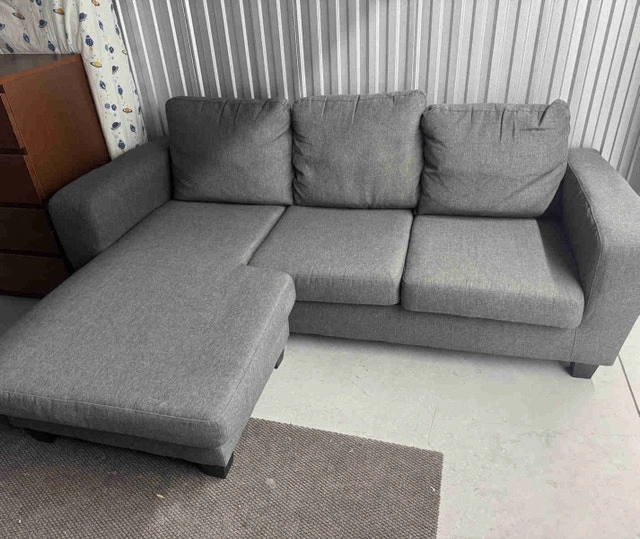 This is a grey three-seater sofa with a left-side chaise. The chaise can be switched to the right side. It's perfect for relaxing in your living room. The sofa is in good condition, showing some signs of wear and tear from use, but is still comfortable and functional. The cushions are plush, and the chaise provides extra lounging space. Self-pickup is available in the Markham area at Kennedy & Steeles. Cash is accepted.
