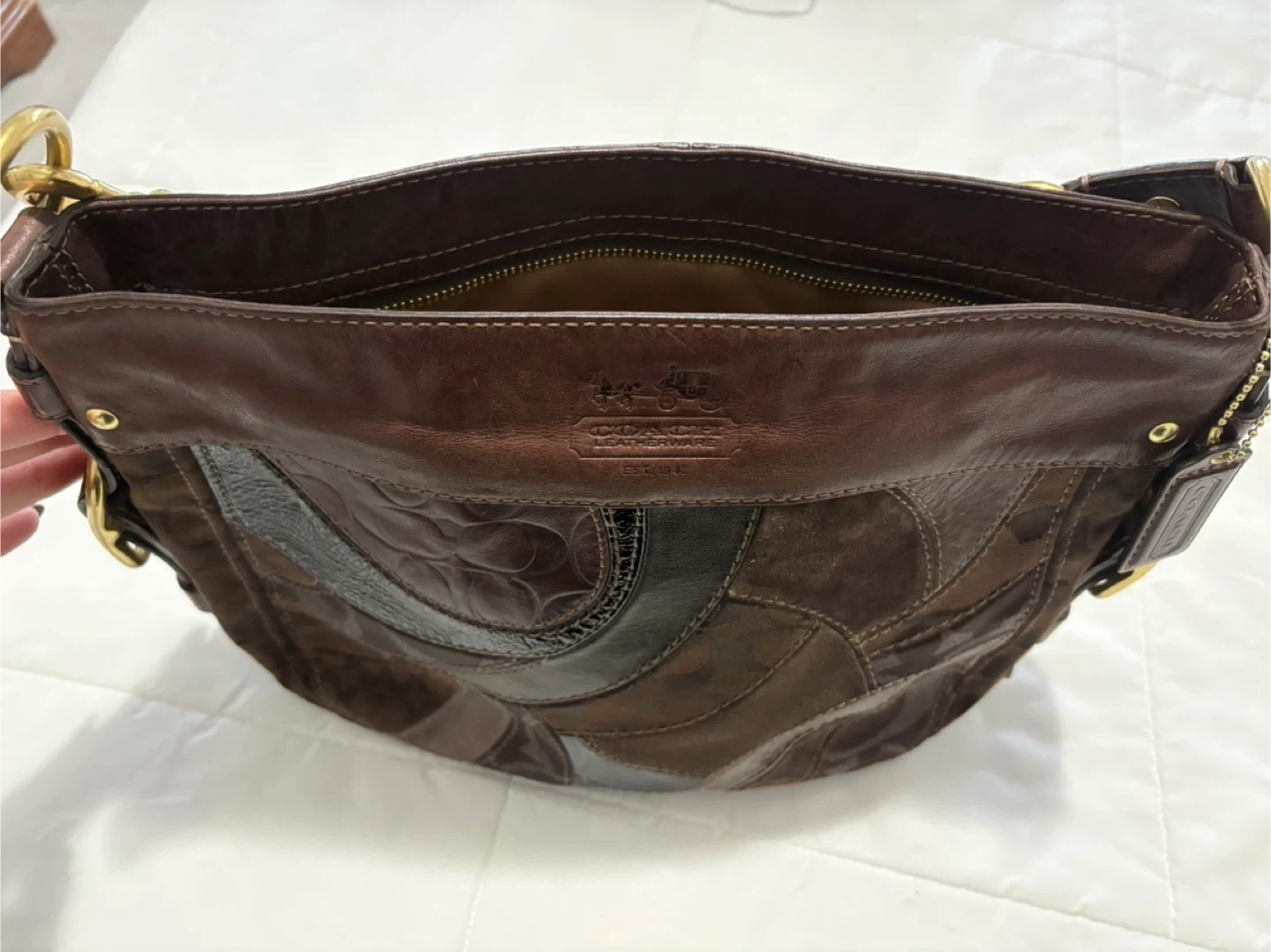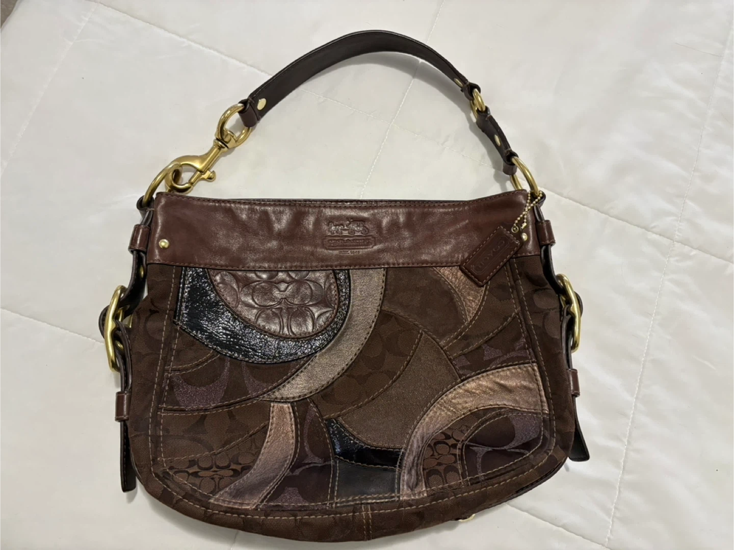 Selling a Coach shoulder bag and matching wallet. The bag and wallet feature a unique patchwork design in various shades of brown. Both are in good condition and ready for a new home! Comes with original Coach tag