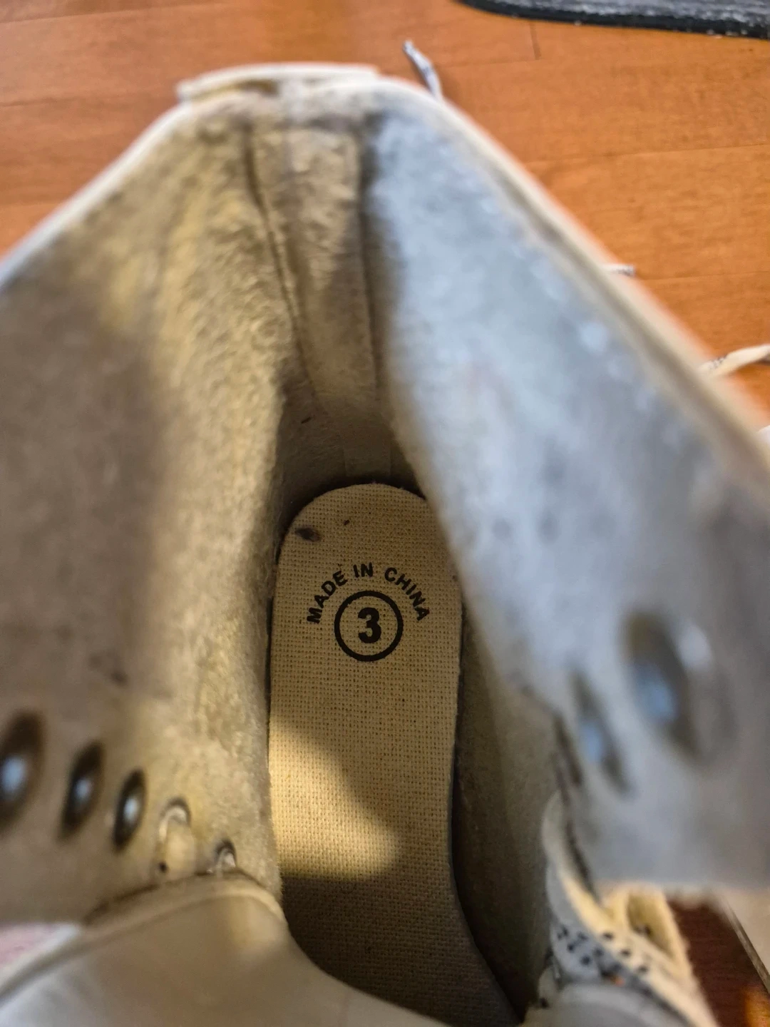 These CCM figure skates are white and size 3. They have laces for a secure fit. Good for beginners or recreational skating.