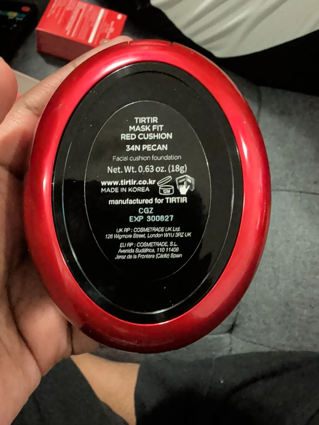 Tirtir Mask Fit Red Cushion foundation in shade 34N Pecan. Net Wt. 0.63 oz (18g). Manufactured in Korea.