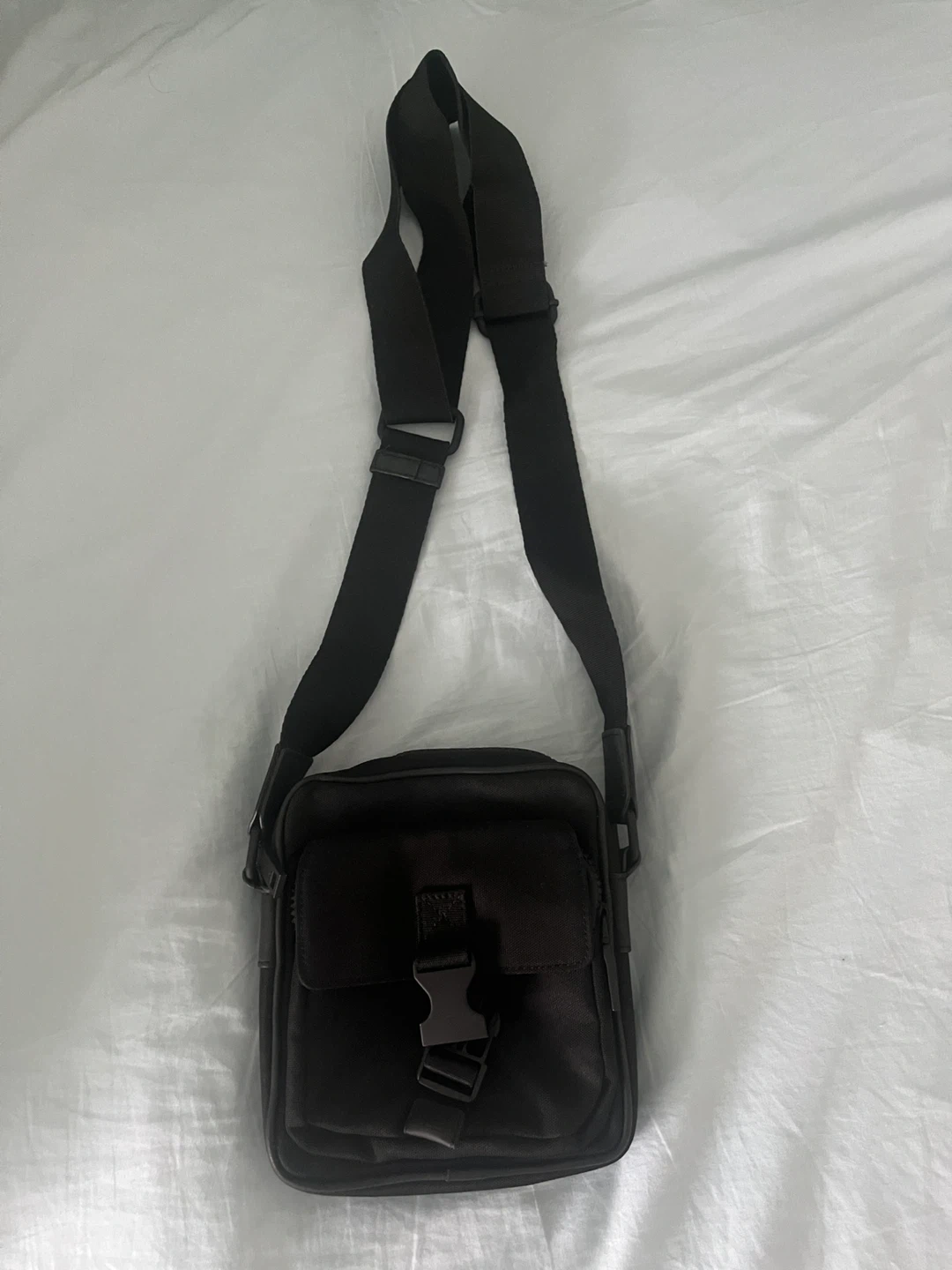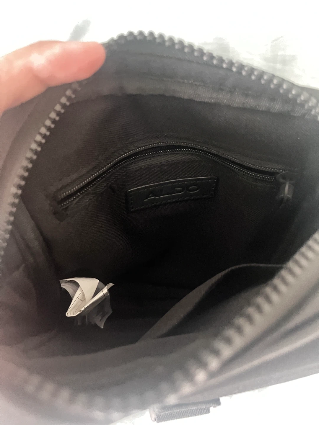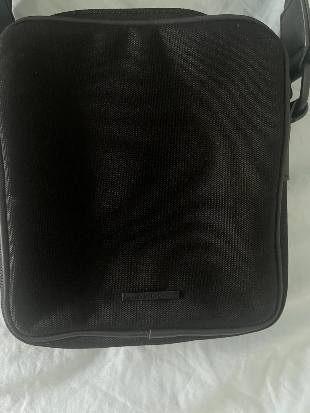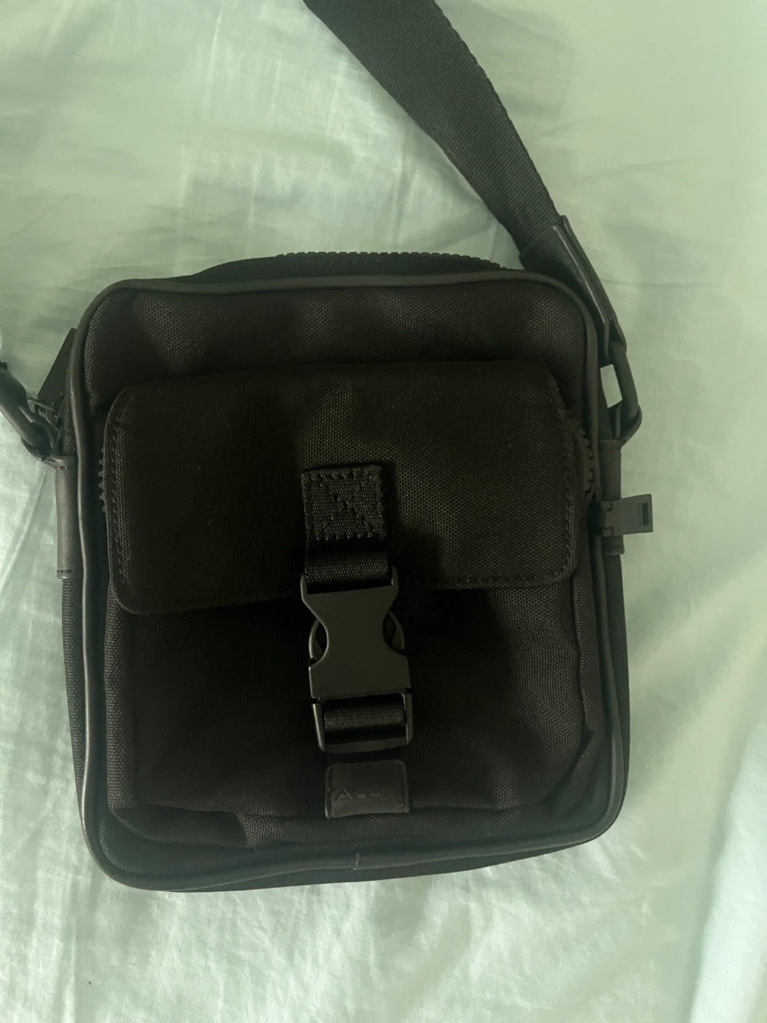 This is an ALDO black side small bag. It's made of a durable fabric material. Features an adjustable strap and multiple pockets for organization.