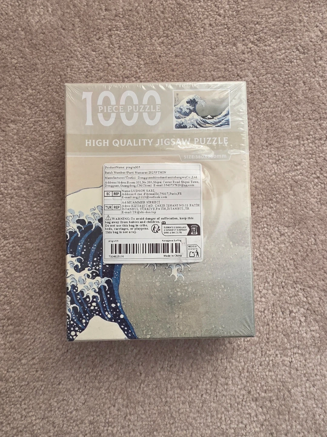 This is a 1000-piece high-quality jigsaw puzzle featuring the Kanagawa Surfing design. The finished puzzle size is 380x260mm. It's made in China. This puzzle is suitable for adults and older children.