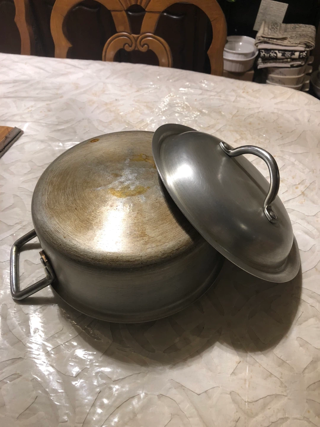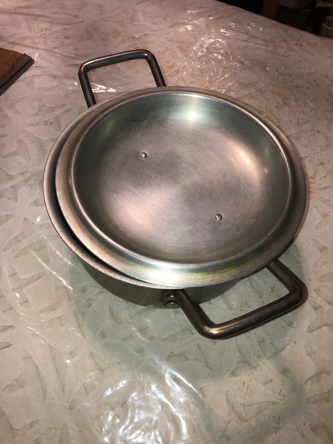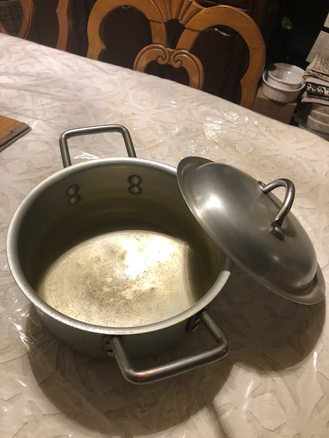 This is a stainless steel pot with two handles and a matching lid. It's suitable for cooking various dishes on the stovetop. The pot is made of durable stainless steel, ensuring even heat distribution. It's a useful addition to any kitchen!