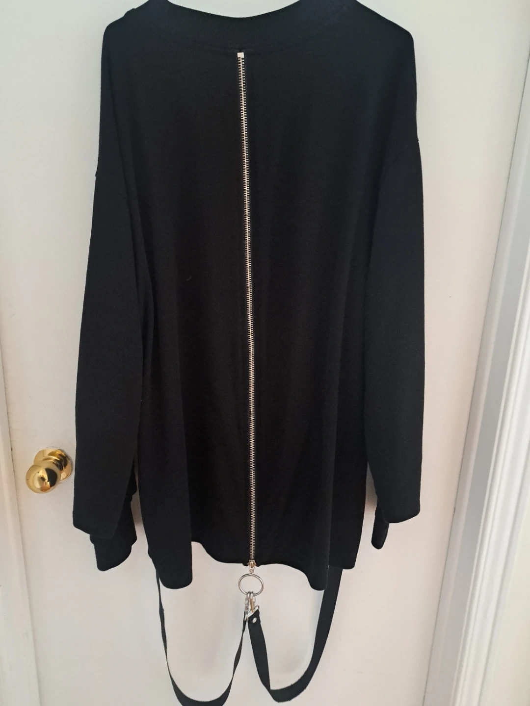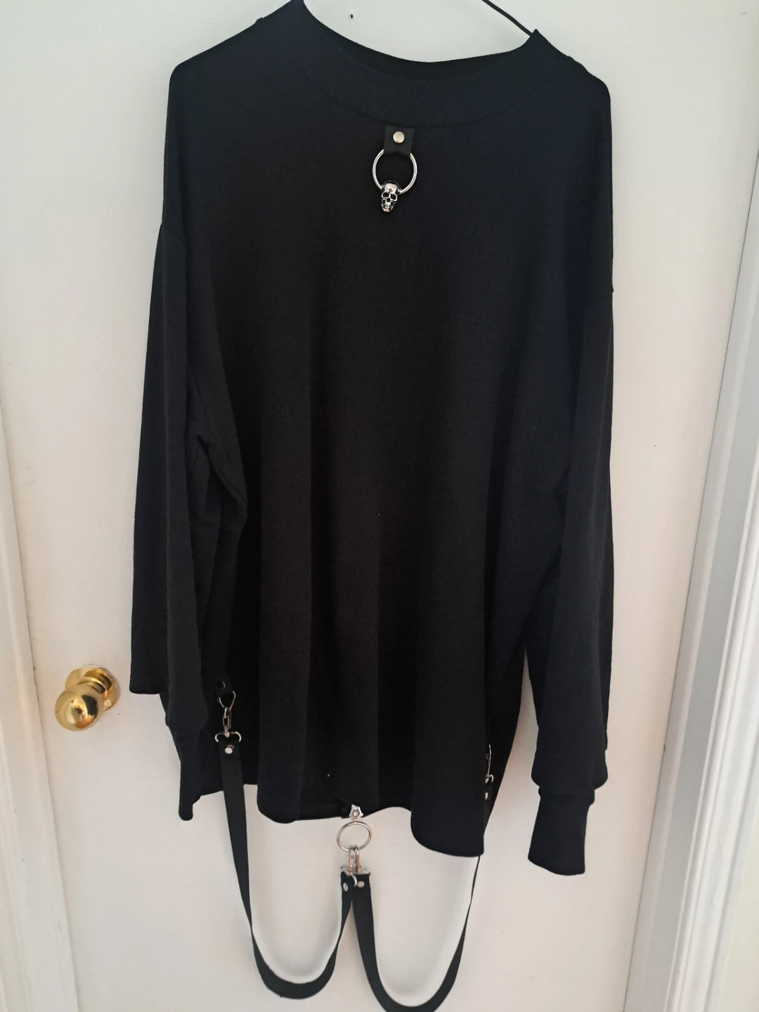 This black oversized crewneck sweatshirt features a unique skull charm and ring detail at the neckline. It has detachable straps with D-ring hardware at the hem. A full-length zipper runs down the back. Fabric appears to be a soft cotton blend. Very good quality heavy