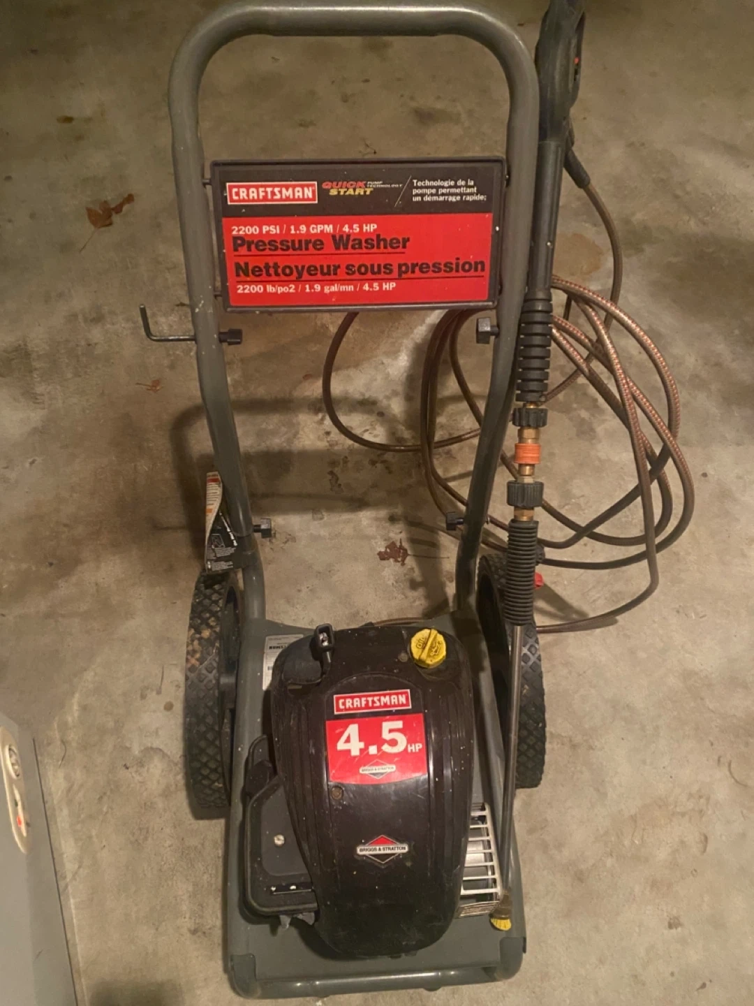 This Craftsman gas pressure washer has 2200 PSI, 1.9 GPM, and 4.5 HP. It features quick start technology. It's powered by a Briggs & Stratton engine.