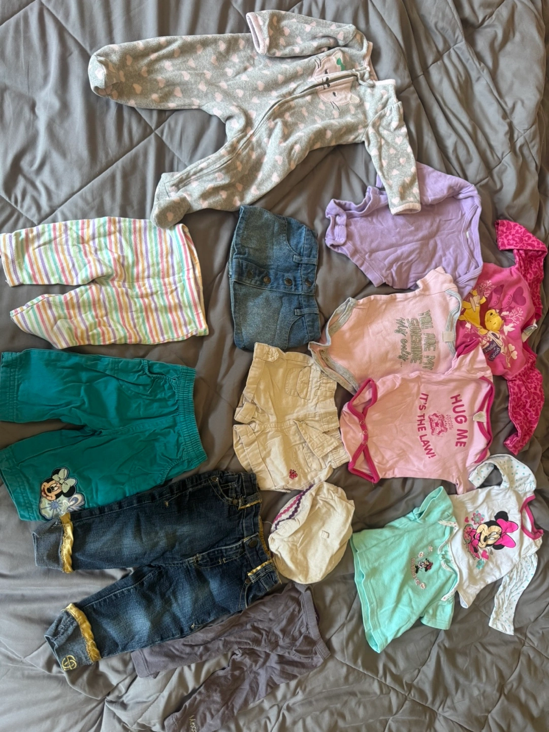 Adorable baby girl clothes bundle, perfect for your little one! Includes various tops, bottoms, and a onesie. Minnie Mouse/pink themed, Ecko jeans Great condition.