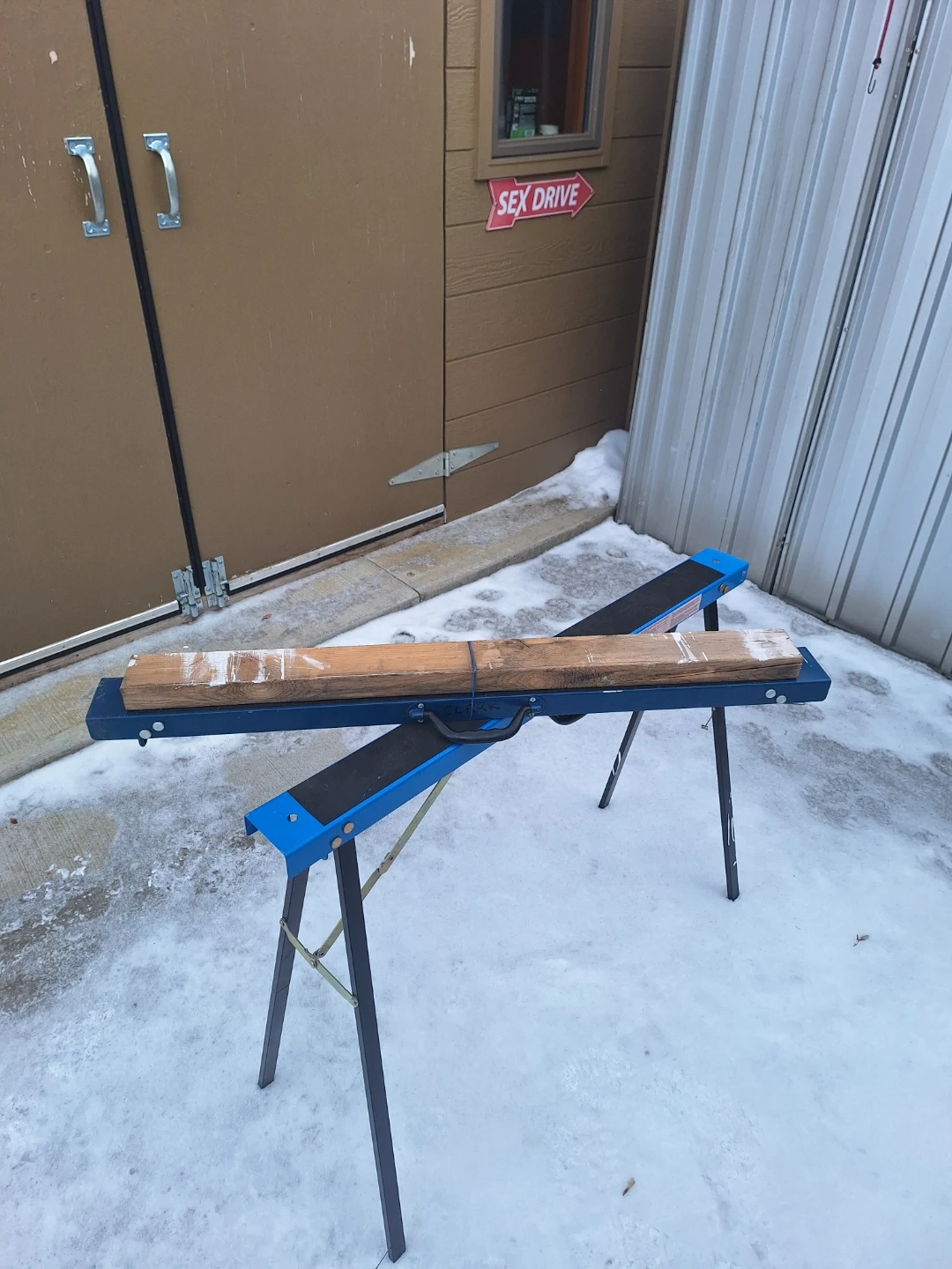 This portable sawhorse work table is great for various projects. It's made with a durable metal frame and both have wood upgraded tops for stability. It's easily foldable for transport and storage. This sawhorse is perfect for DIY enthusiasts and professionals needing a convenient workspace.