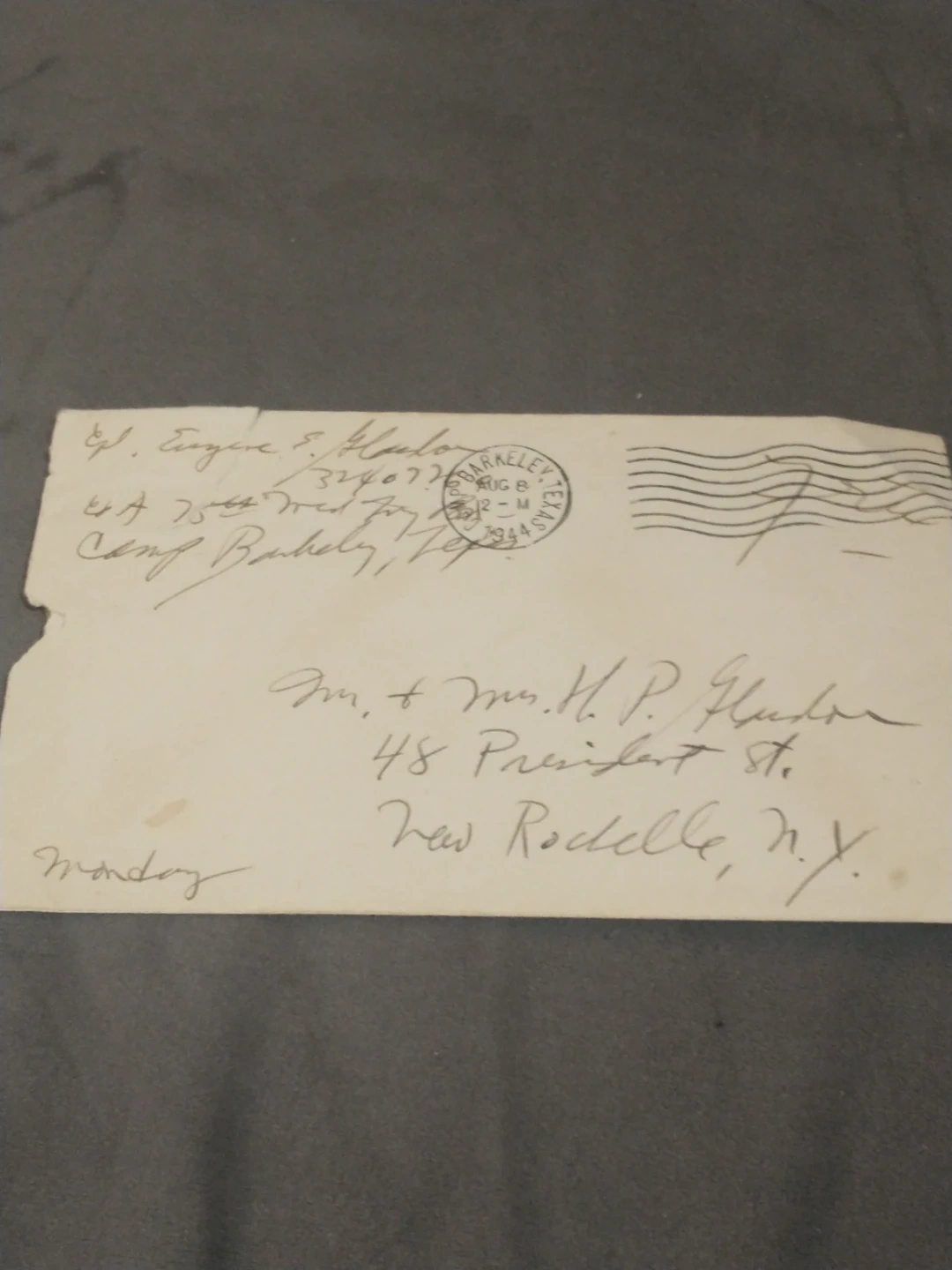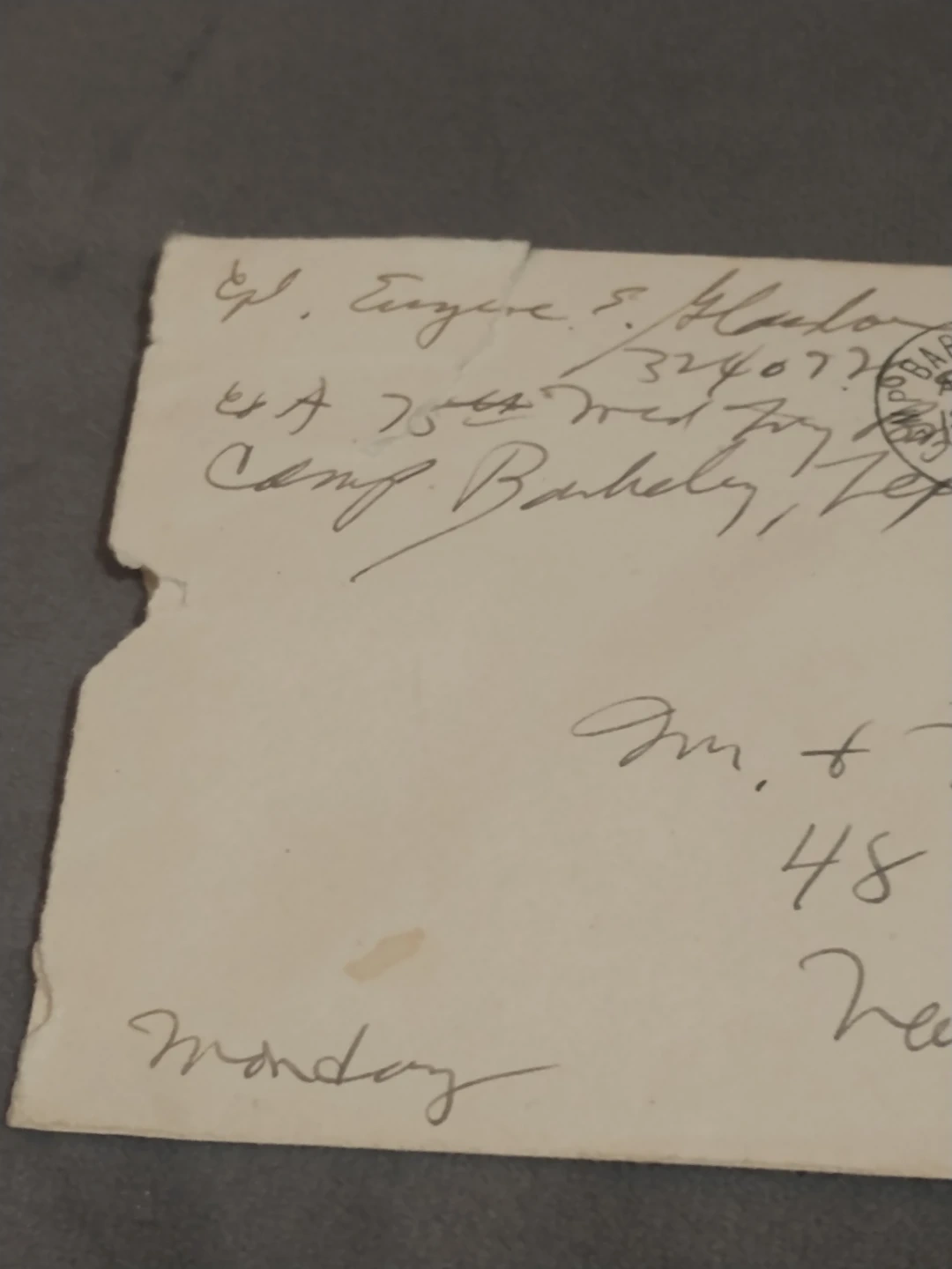 This is a WWII franked envelope with writing and a postmark from Camp Barkeley, Texas to a soldier's family or friends in NY. Members of the US military wrote 'free' at the top right so they did not need to pay postage. In box 5.