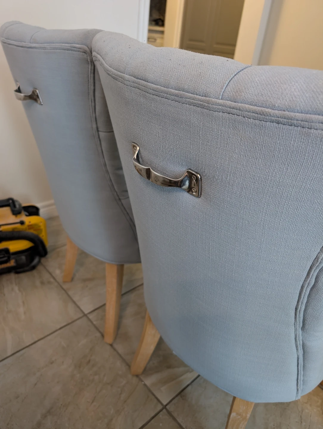 Selling a set of two upholstered dining chairs. They feature a classic design with button-tufted backs and a light blue/grey fabric. The chairs have sturdy wooden legs and a convenient handle on the back.