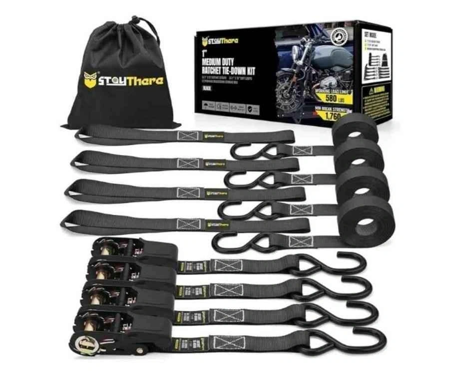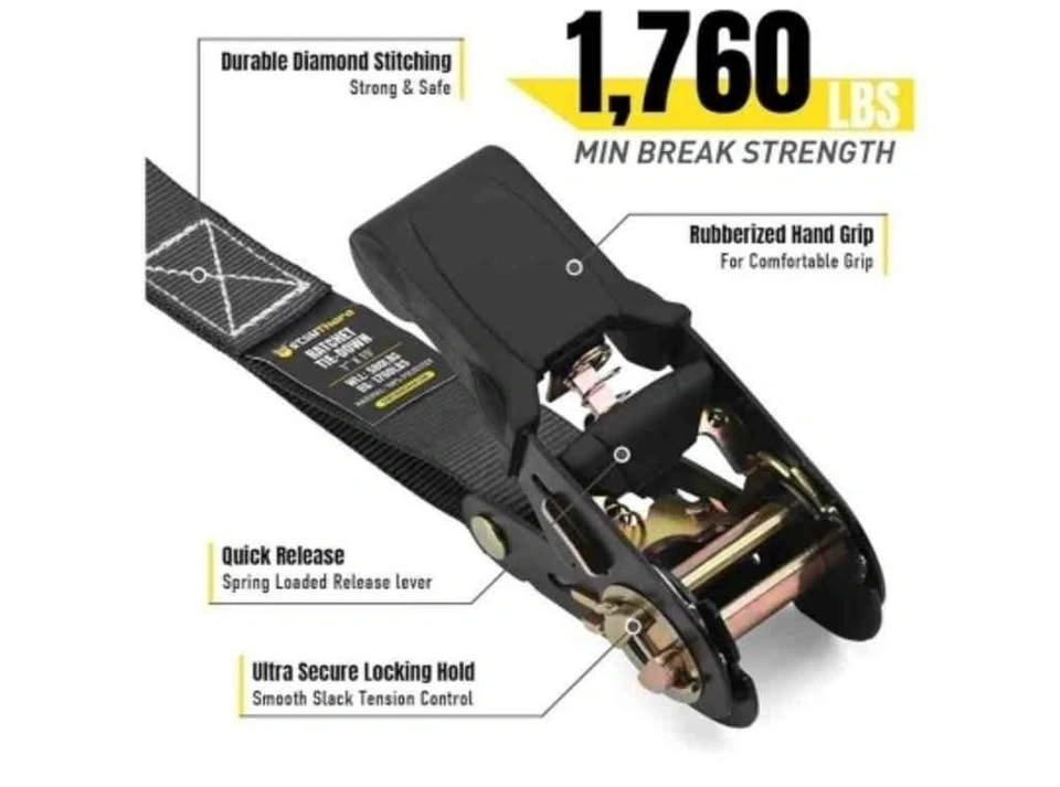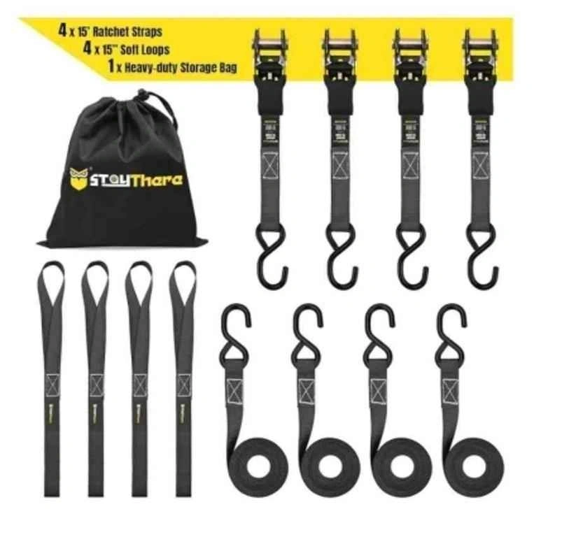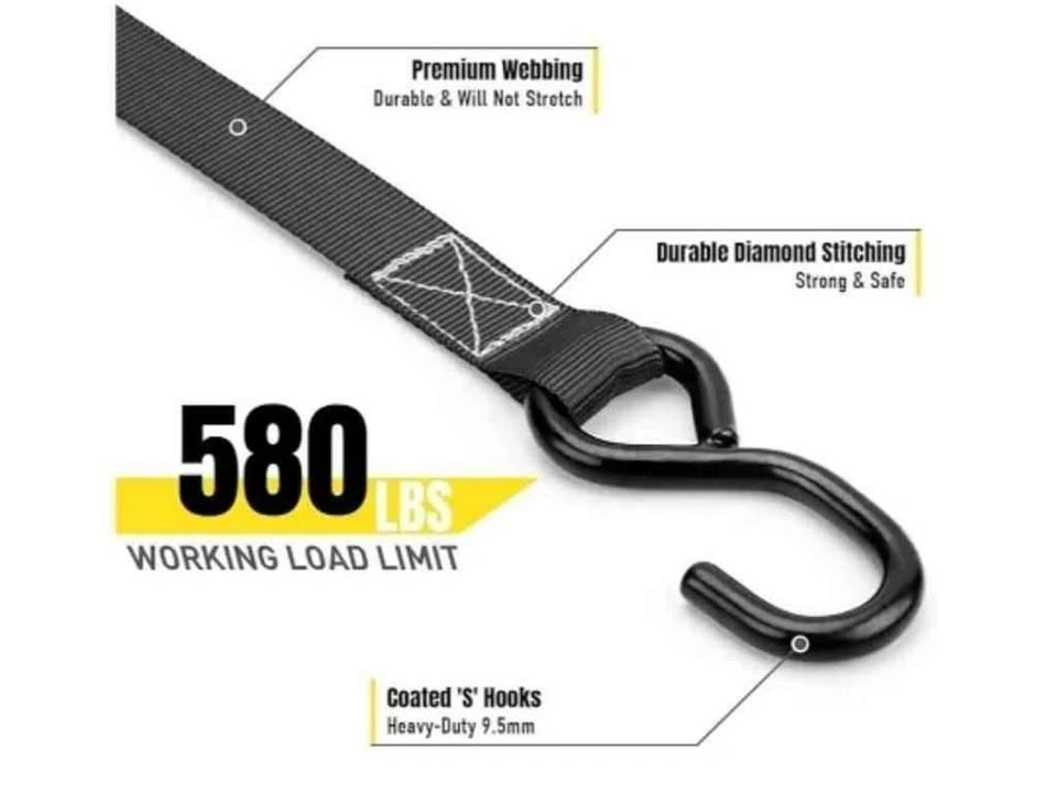 New in box. Ratchet Straps with S Hook - 1760lb Break Strength for Securing Motorcycle, Kayak, Truck with Rubber Handles, A Sturdy Bonus Bag & 4 Soft Loops Included, Black. Feel free to message if you have any questions!