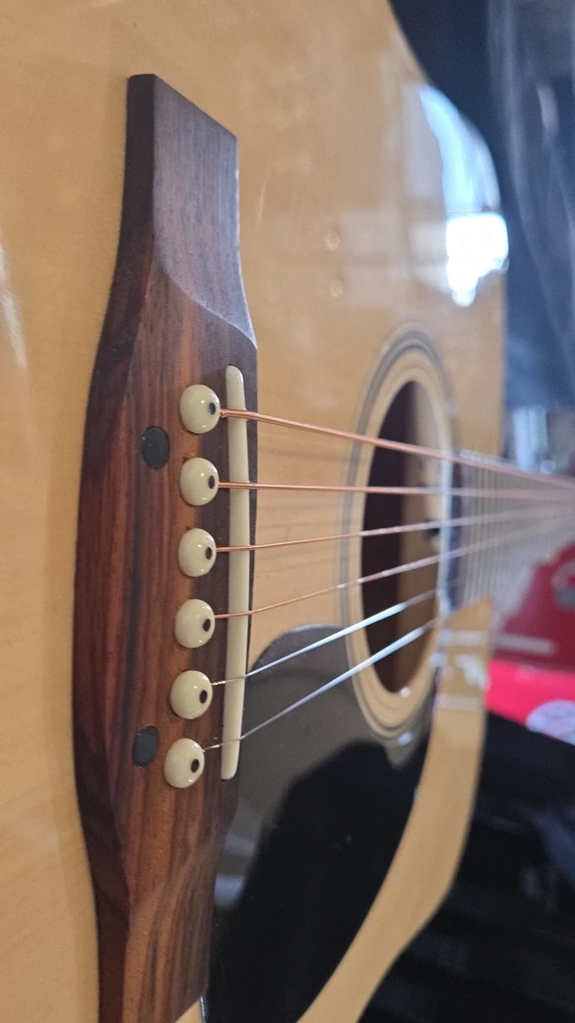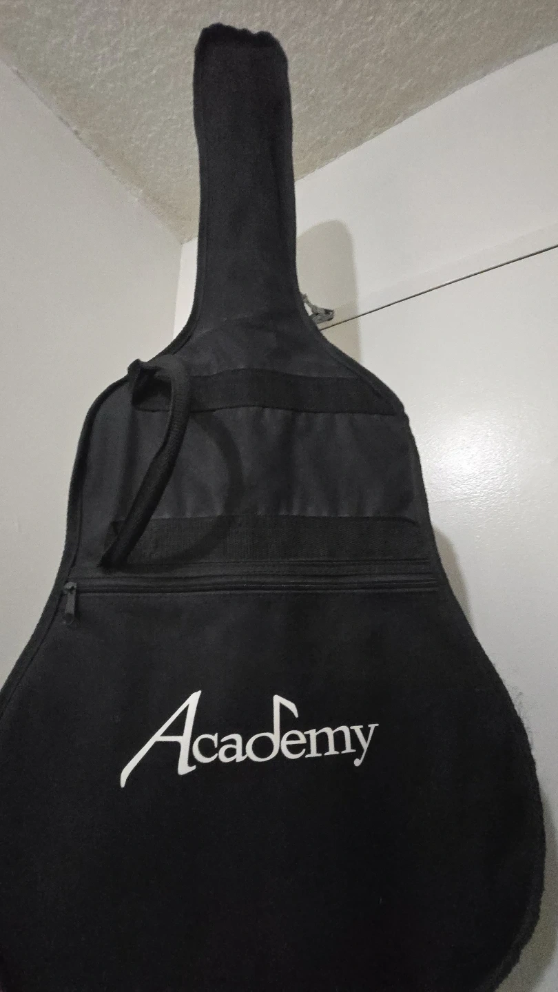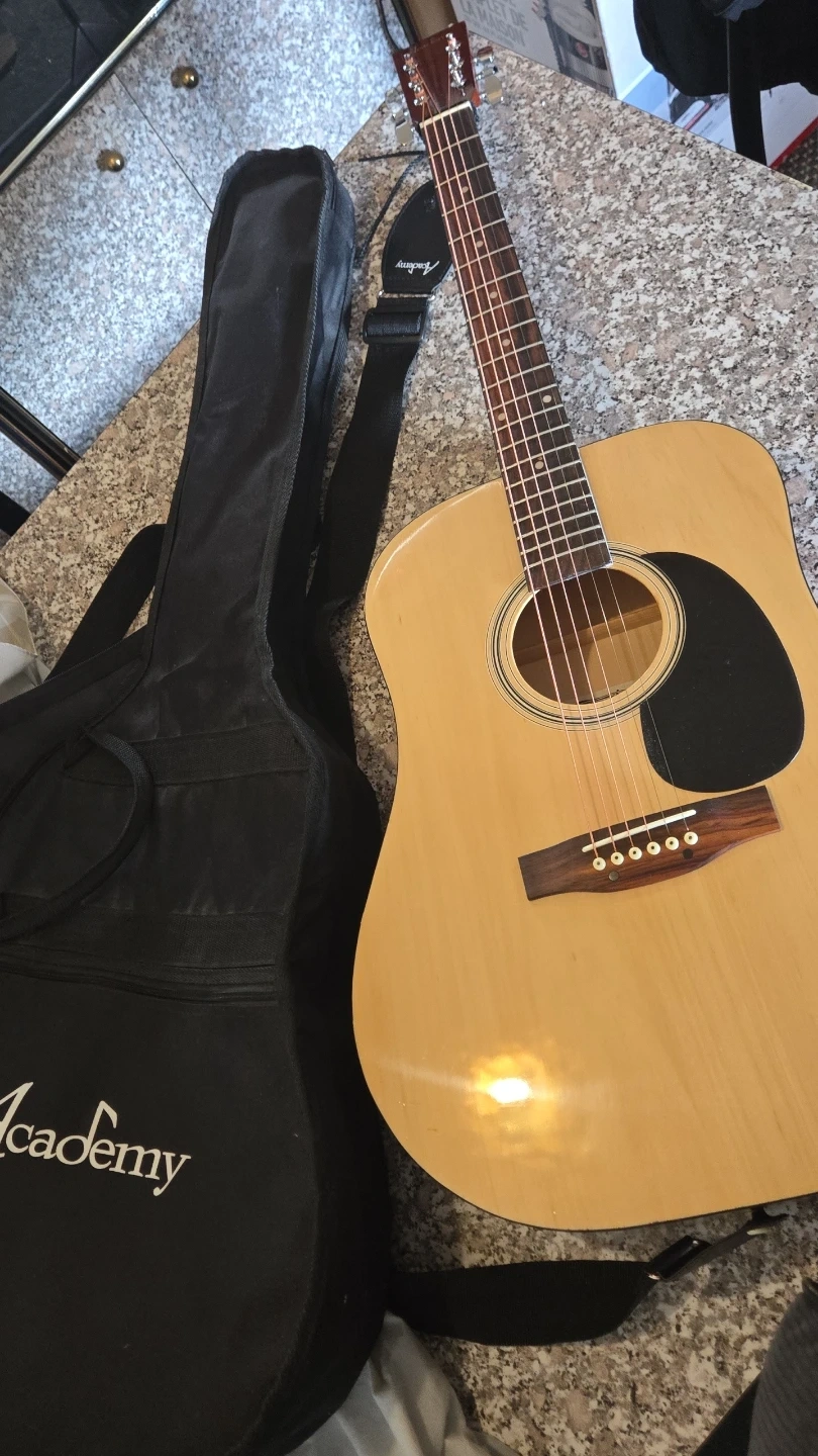 Acoustic guitar from Academy. Includes a black gig bag for transport. Six strings. Natural wood finish. Mint condition bought for son he never used it