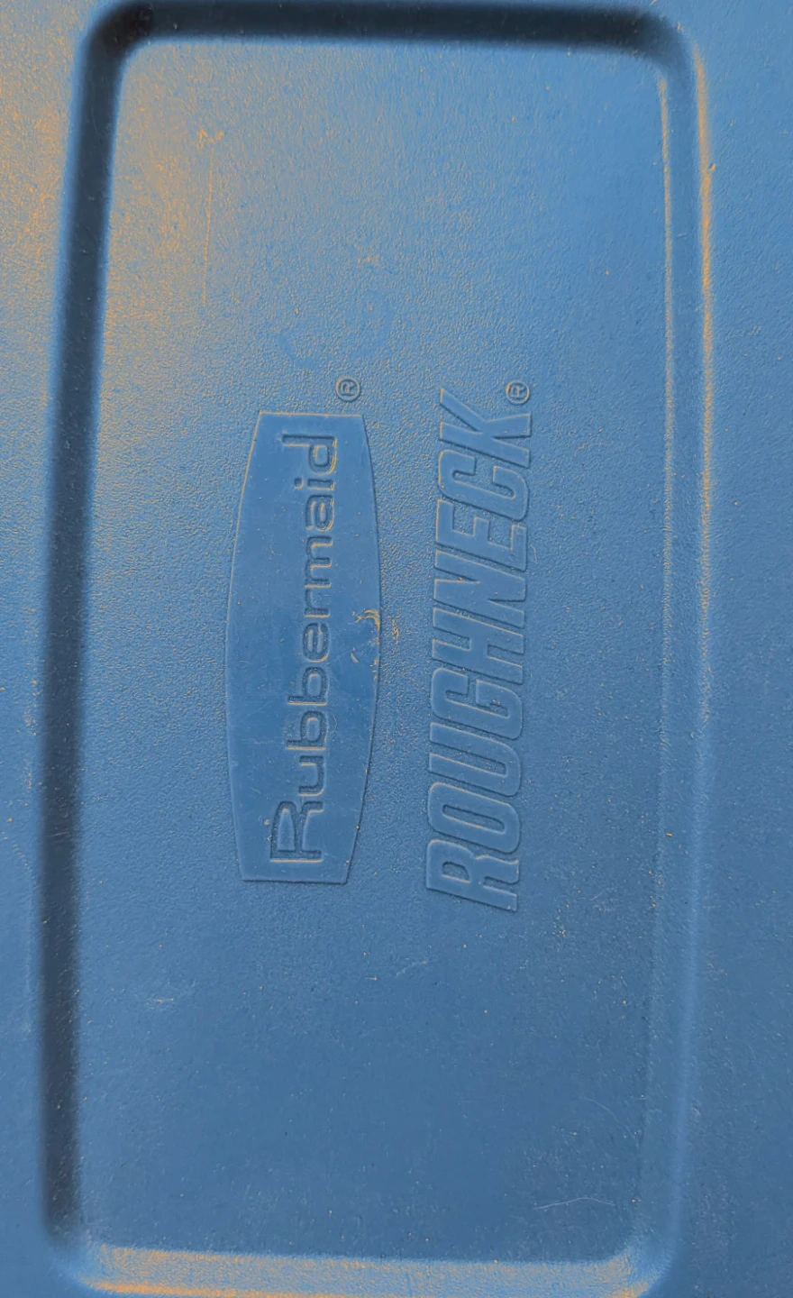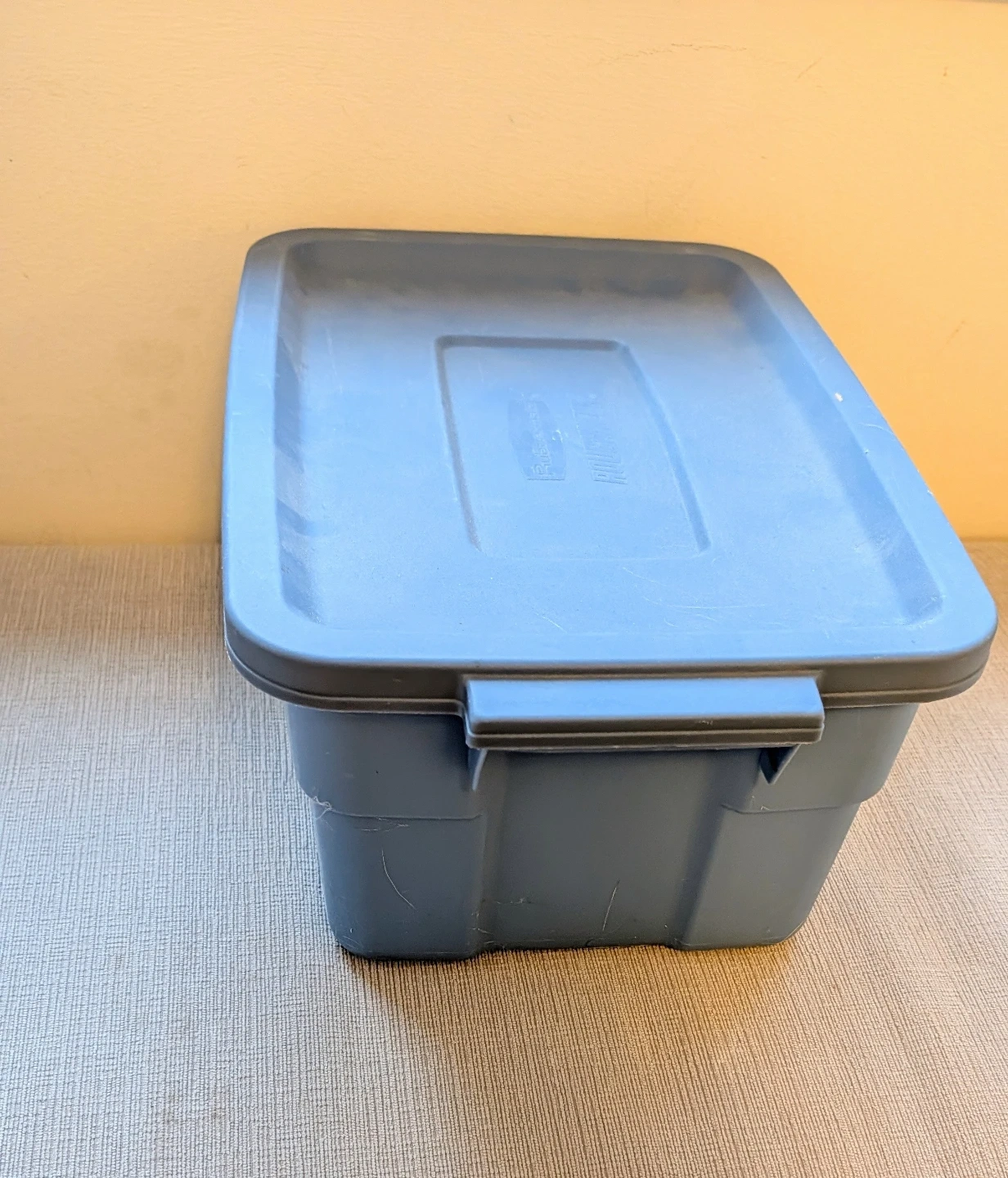 This is a blue Rubbermaid Roughneck storage bin with a lid. It's a durable plastic bin suitable for organizing various items. The lid snaps on securely to keep contents protected.