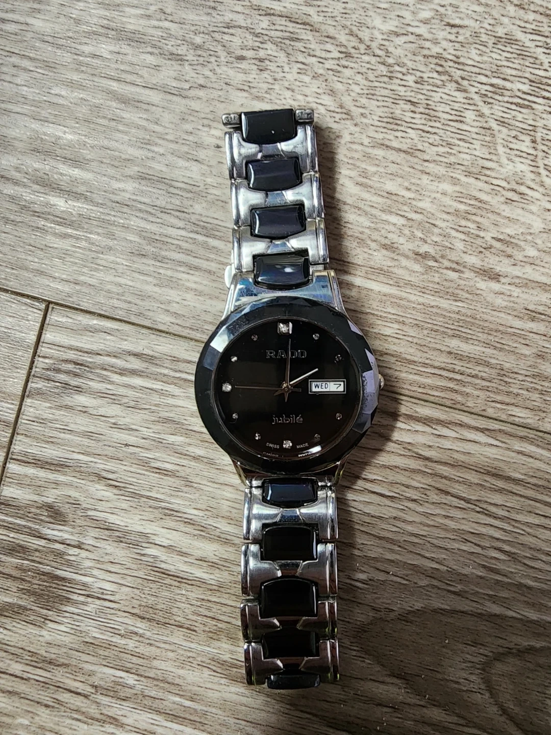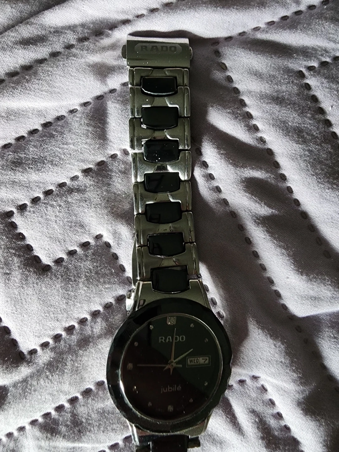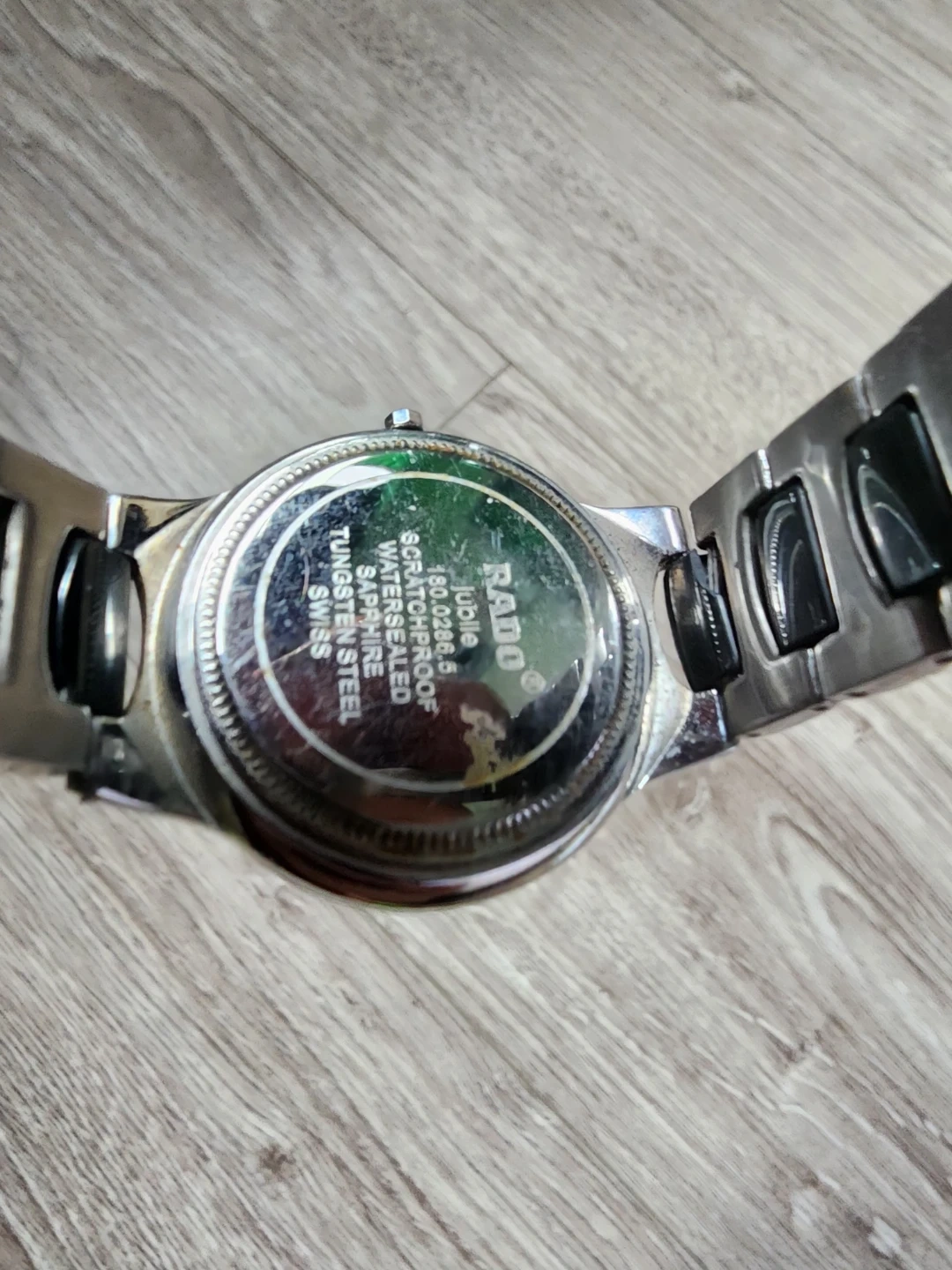 This RADO watch is from the Jubilé collection. It's Swiss made with a scratchproof sapphire crystal and tungsten steel band. Water-sealed.