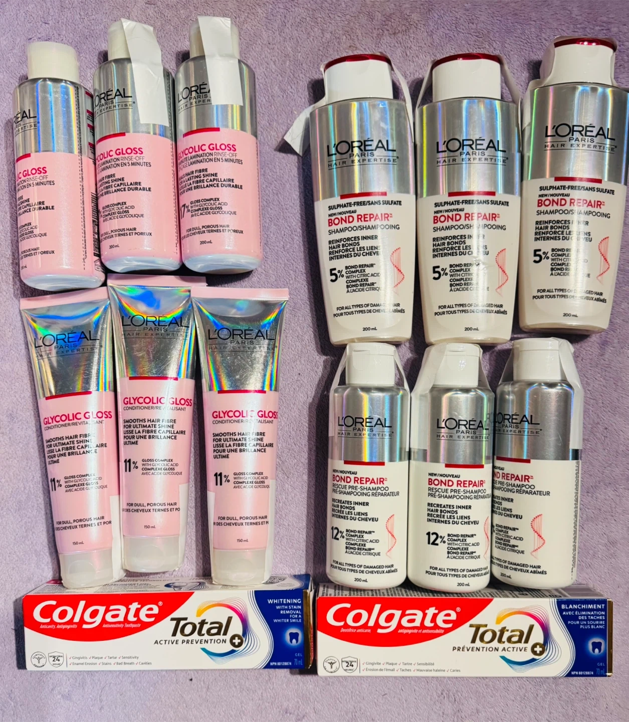 This lot includes L'Oréal Paris Glycolic Gloss Rinse-Off Lamination treatments and Bond Repair Shampoo/Pre-Shampoo. The Glycolic Gloss is for dull, porous hair to smooth fibres and add shine. The Bond Repair products reinforce inner hair bonds. Two Colgate Total Active Prevention whitening toothpaste tubes are also included.