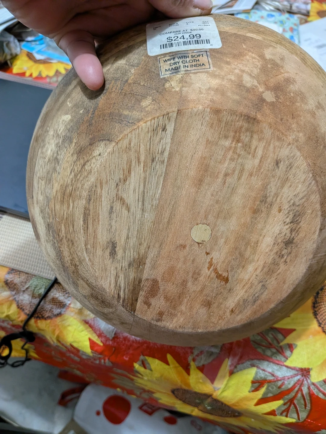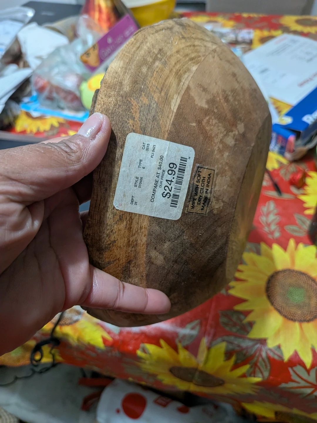 This is a rustic wooden salad bowl, made in India. It's perfect for serving salads or as a decorative centerpiece. Wipe clean with a soft, dry cloth.