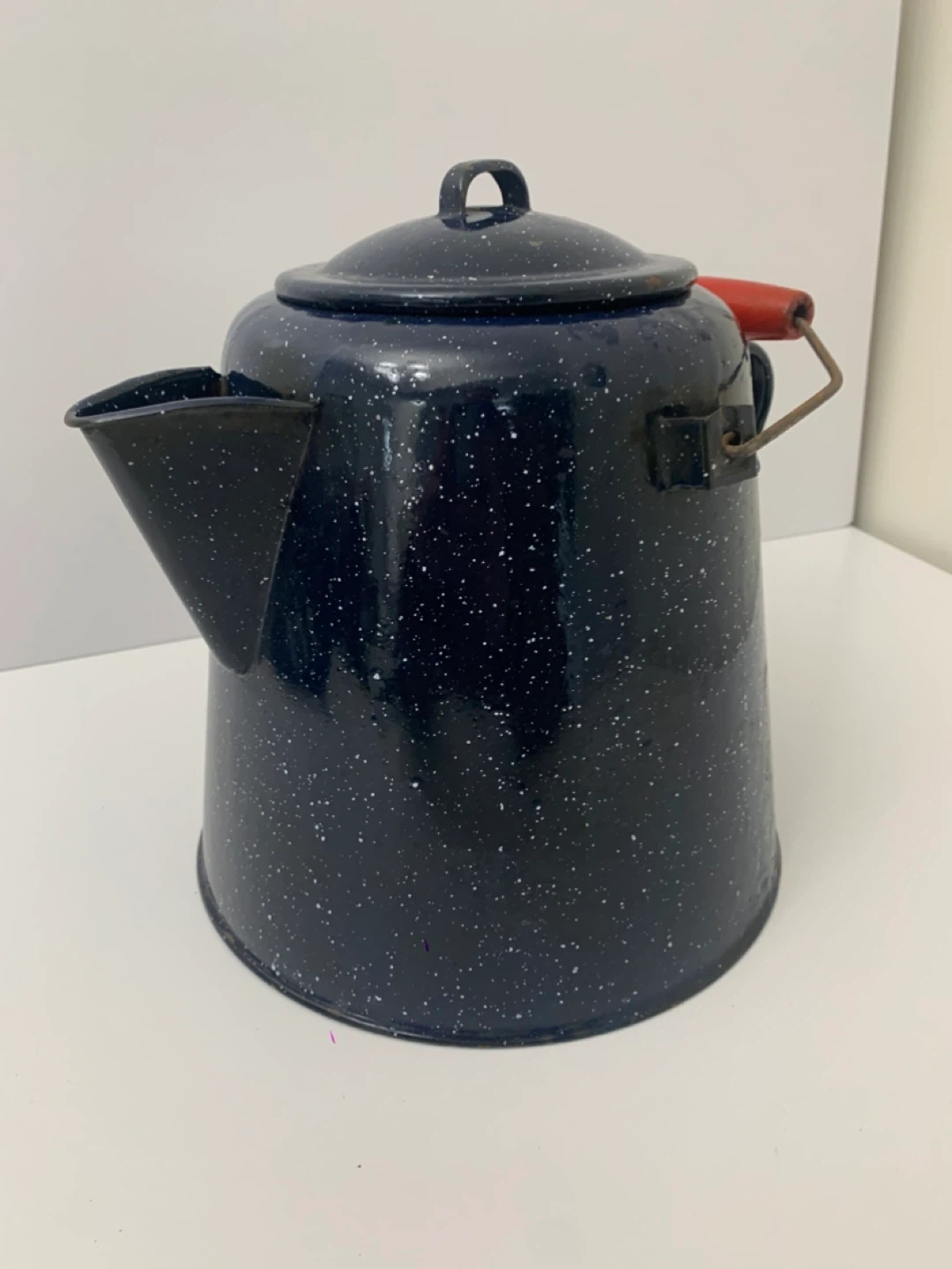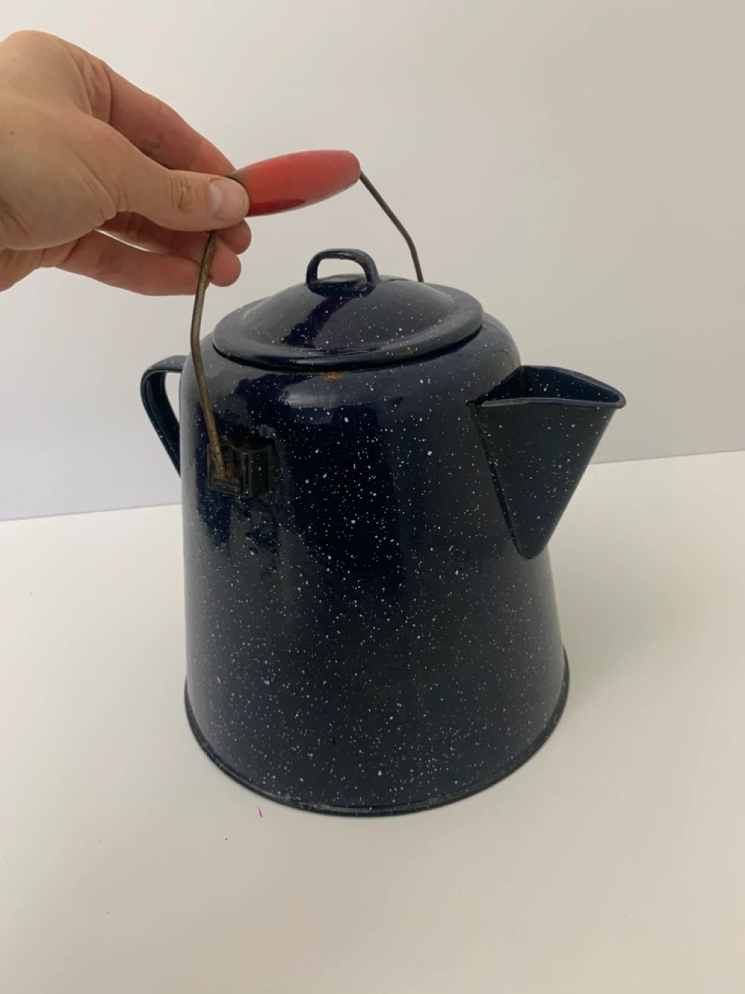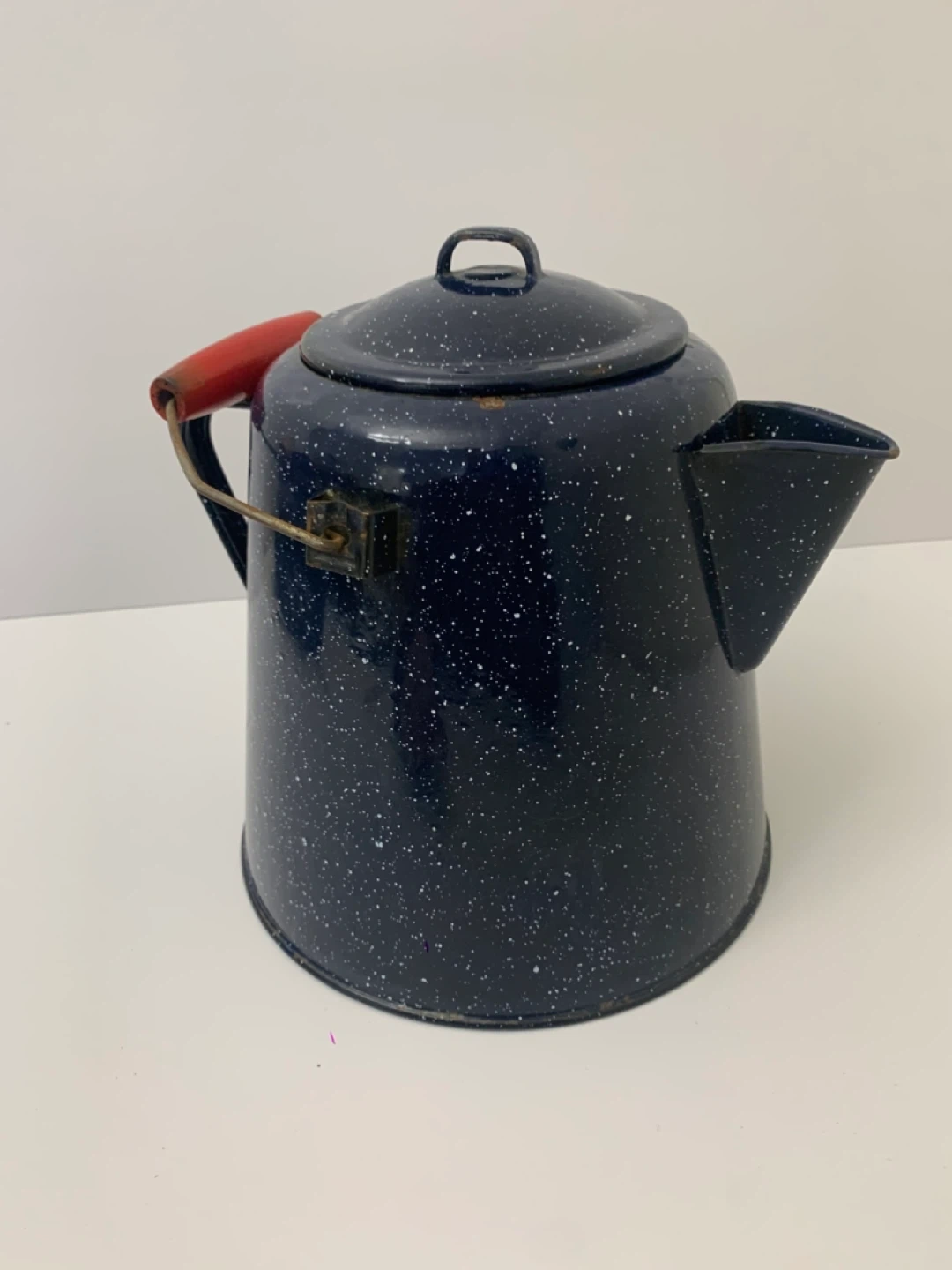 A dark blue speckled enamelware coffee pot. It has a red handle and a traditional pour spout. Great for camping or rustic kitchen decor!