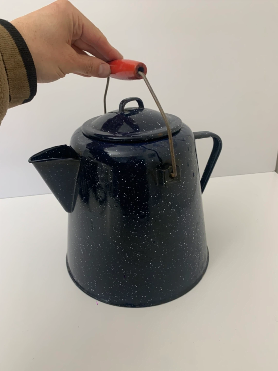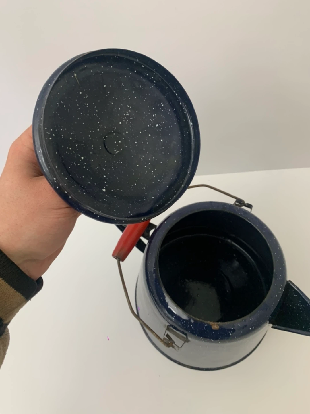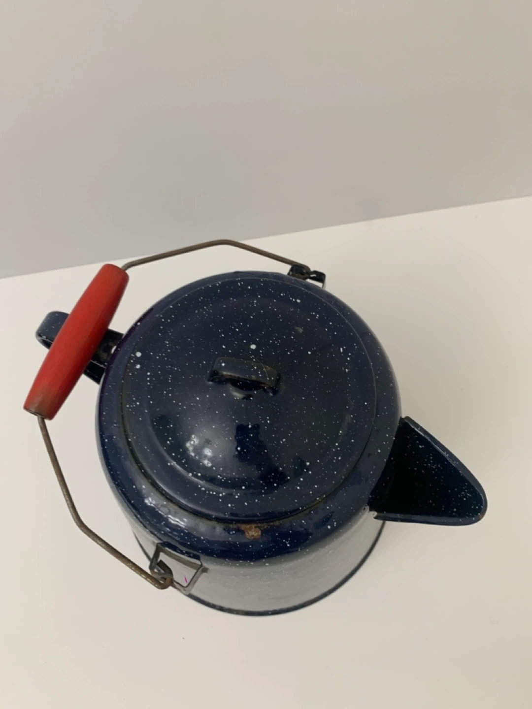 A dark blue speckled enamelware coffee pot. It has a red handle and a traditional pour spout. Great for camping or rustic kitchen decor!