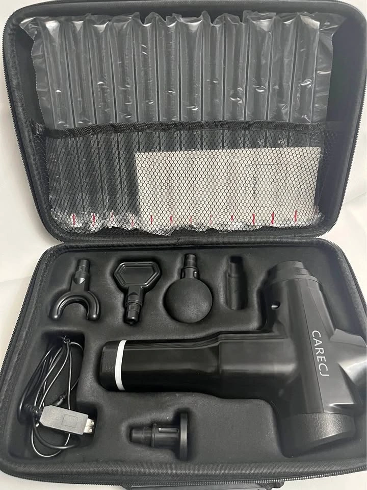 Awesome CARECI muscle massage gun. Comes with 4 different massage heads, charging cable, and a hard shell carrying case. Has an LCD touch screen for adjusting settings. Good for easing muscle soreness and recovery.