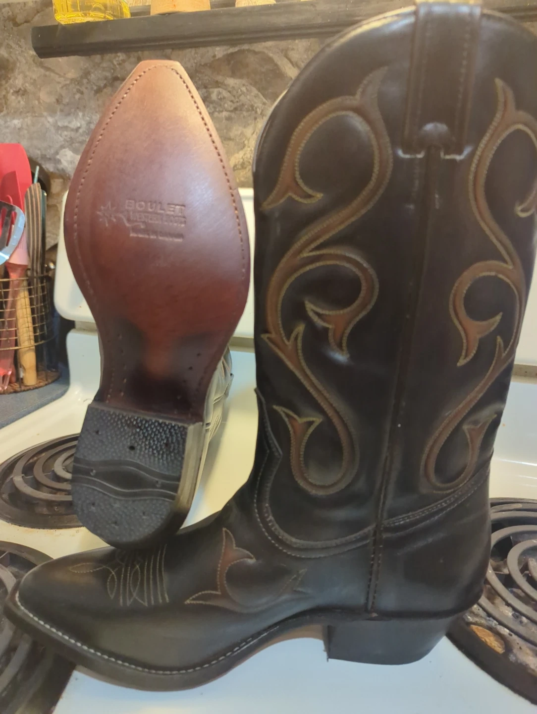Classic Boulet Western cowboy boots made of brown leather. Features intricate stitching details on the shaft and a durable sole. Perfect for rodeo or everyday wear!