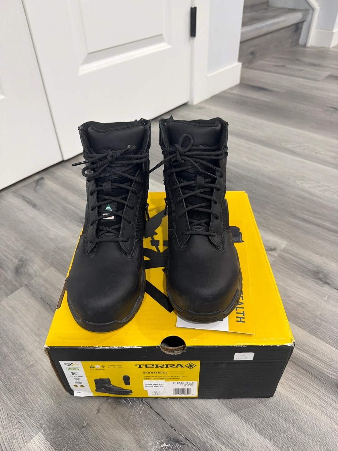 Terra EKG Stealth work boots in black. Men's size 5.5, Ladies' size 7.5. Features oil and slip-resistant outsole and a composite safety toe. Includes original box.