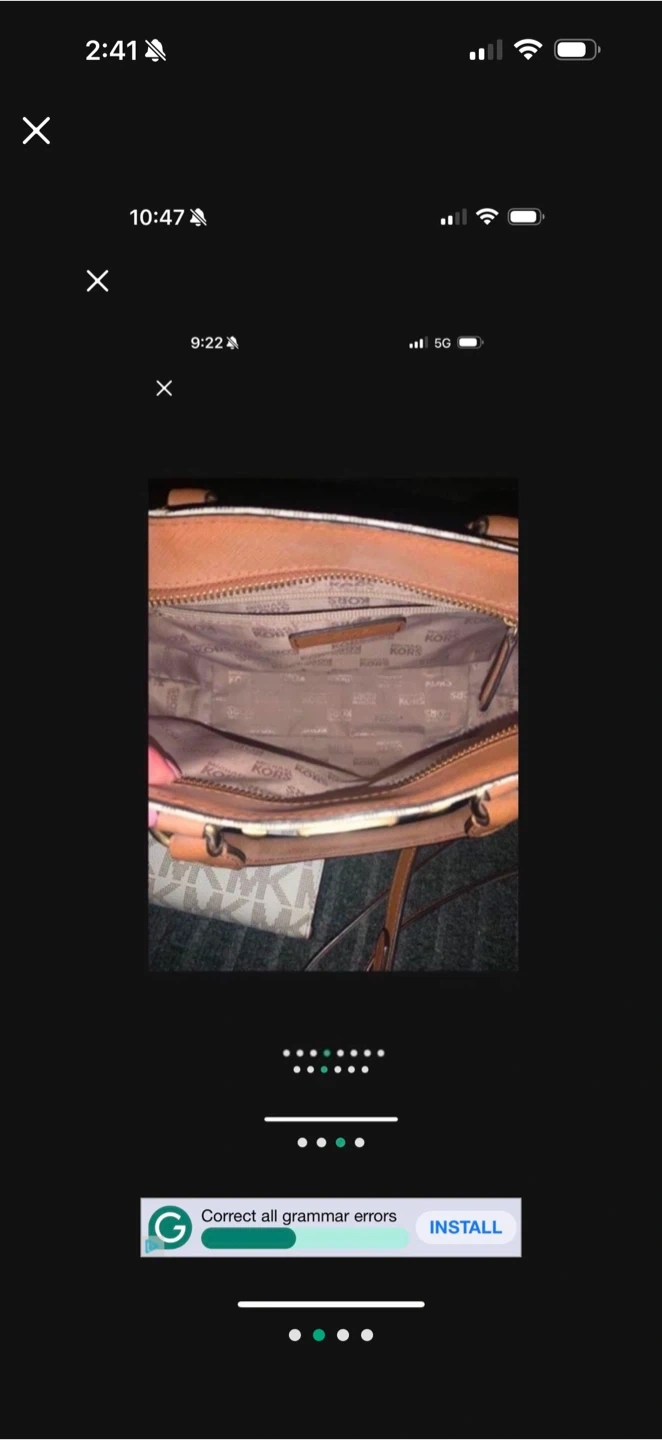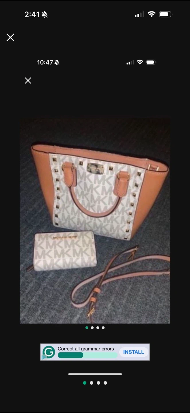 This Michael Kors set includes a satchel bag and a matching wallet. Both items feature the iconic MK signature logo print with tan leather accents. The satchel has studded detailing and a removable shoulder strap.
