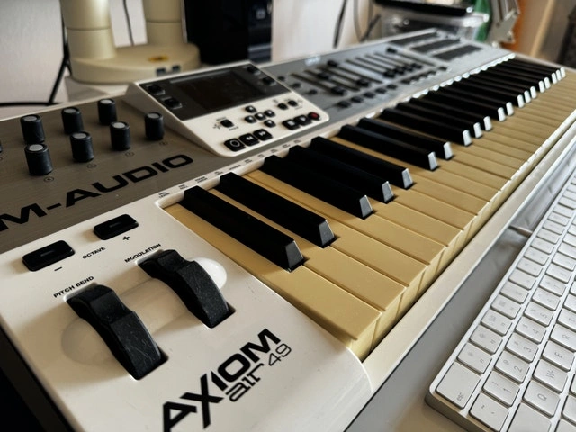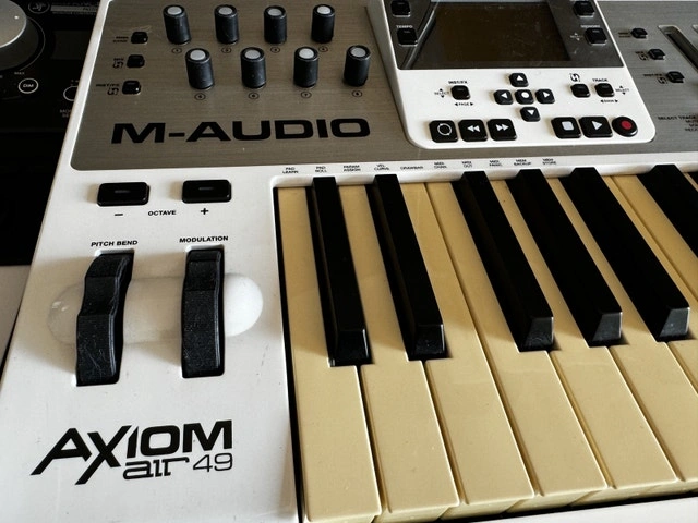 M-Audio Axiom Air 49 MIDI keyboard, perfect for producers and musicians looking for a versatile controller. It's in good condition and has been well-maintained in my home studio. This keyboard features 49 semi-weighted keys, assignable knobs, pads, and faders, providing comprehensive control over your favourite music software. Great for composing, producing, and performing!