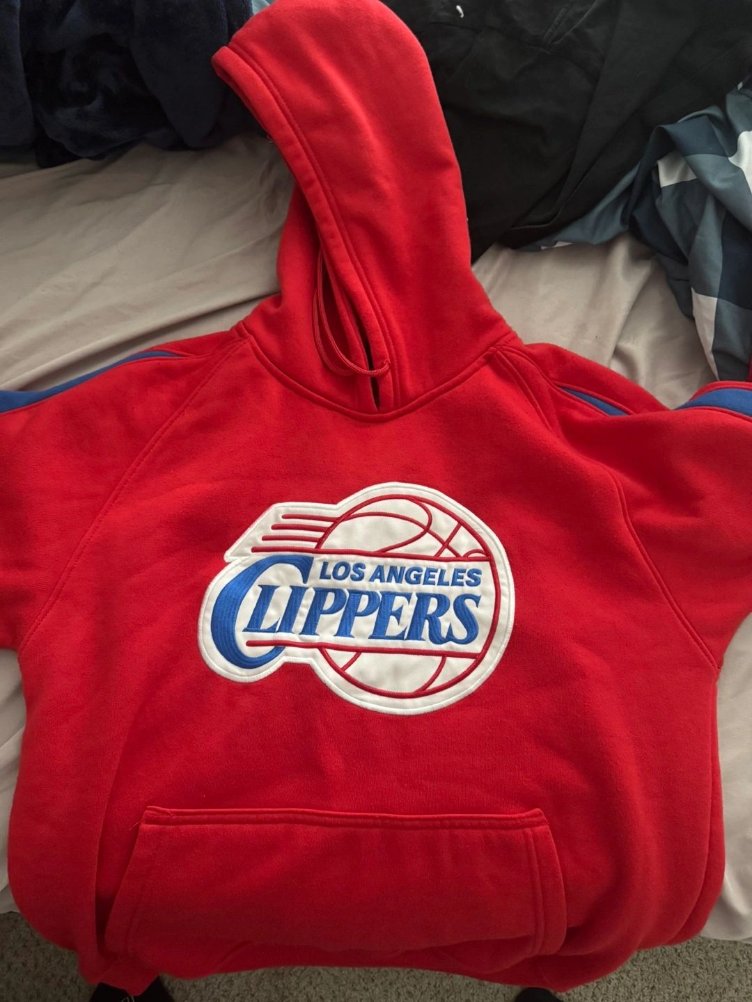 Red LA Clippers hoodie. Features team logo on the chest. Blue and white accents. Medium size.