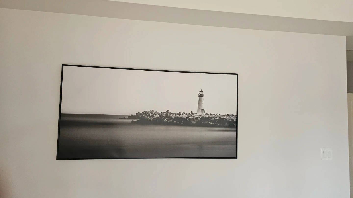 A framed print featuring a black and white photograph of a lighthouse on a rocky outcrop. It's a classic coastal scene perfect for adding some character to your home. The print has a sleek black frame.