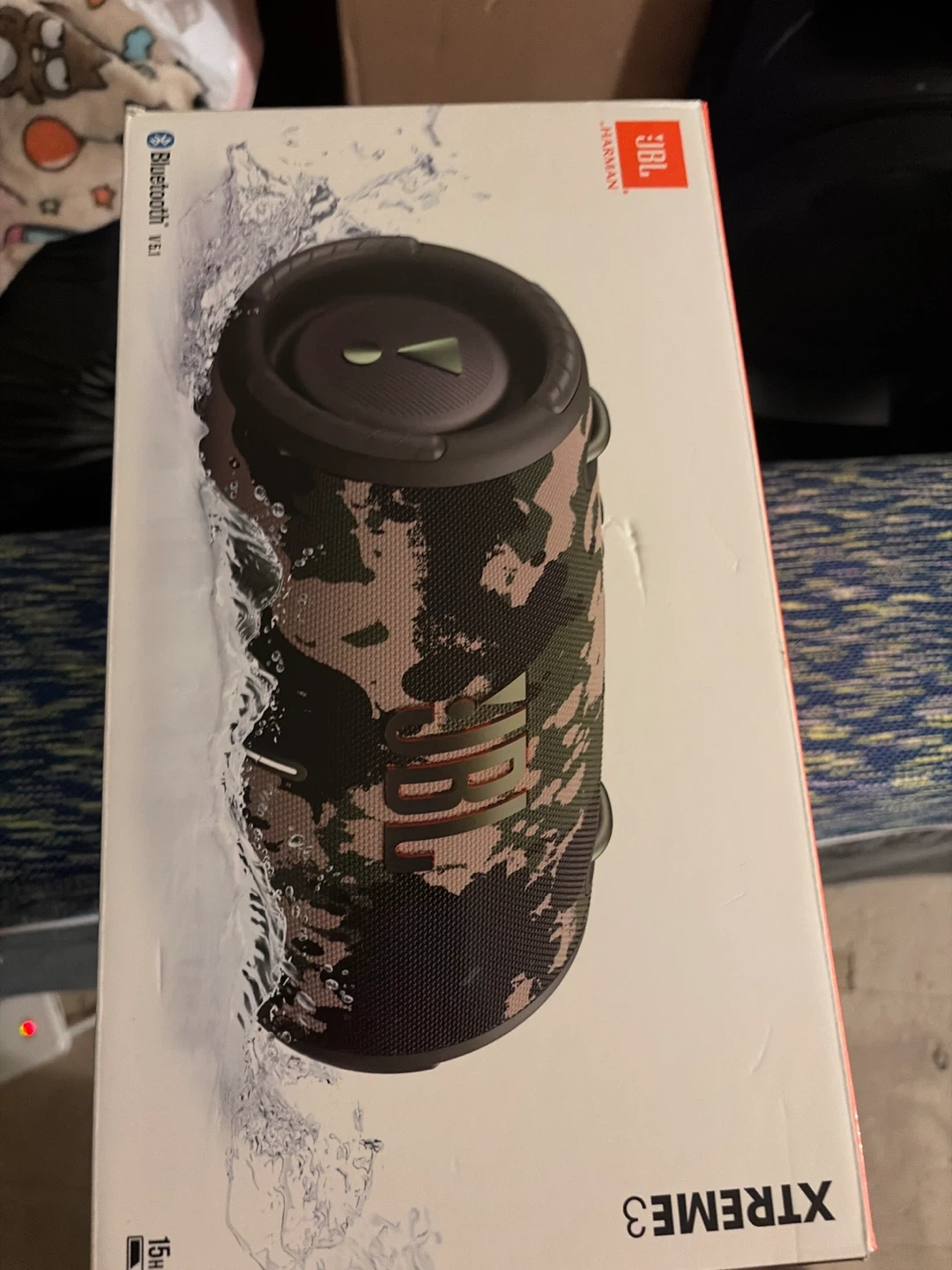 JBL Xtreme 3 portable speaker. It's waterproof and dustproof with Bluetooth 5.1. Offers 15 hours of playtime. Includes a shoulder strap.