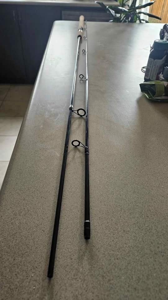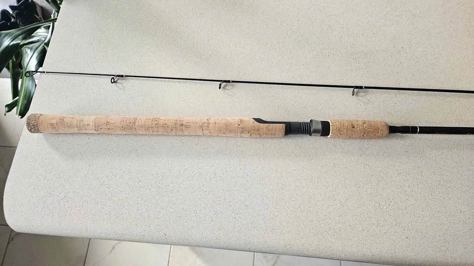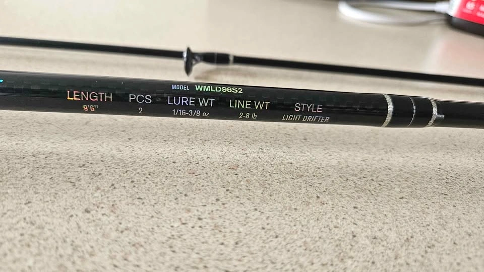 High-quality 9'6" graphite fishing rod, 2-piece Wright & McGill Essentials IM7 Light Drifter model. Lure weight 1/16-3/8 oz, rated for 2-8 lb line. Black carbon fiber finish with a comfortable cork handle and durable guides.