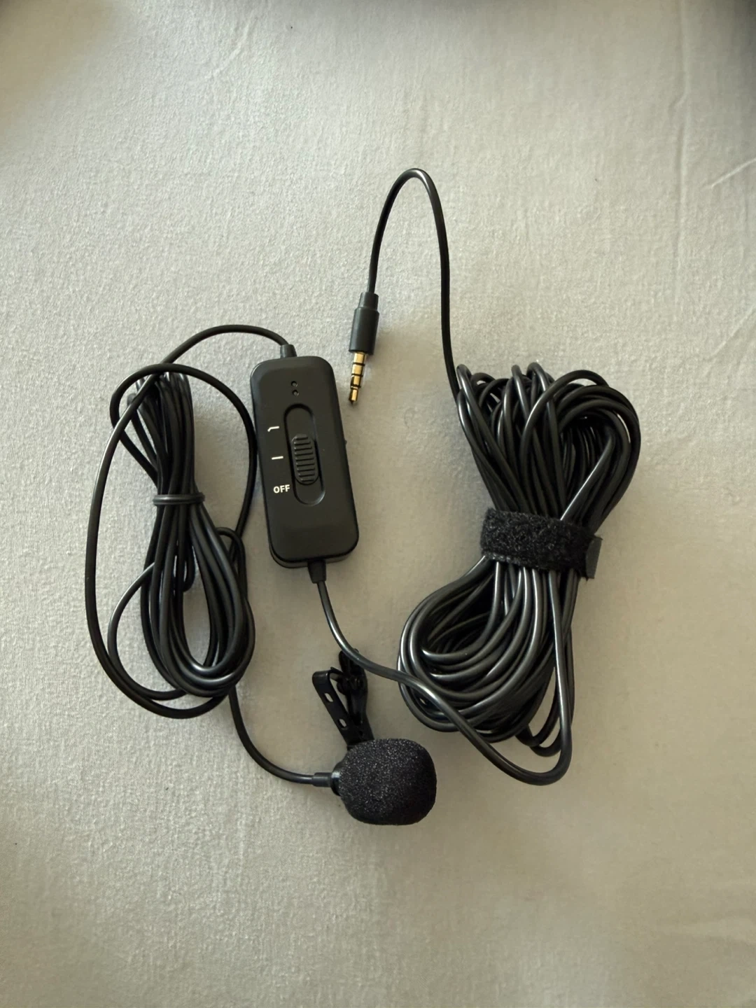 This is a black lavalier microphone, ideal for recording clear audio. It features a long cable and a 3.5mm audio jack for broad compatibility. The clip-on design makes it easy to attach to clothing for hands-free use.