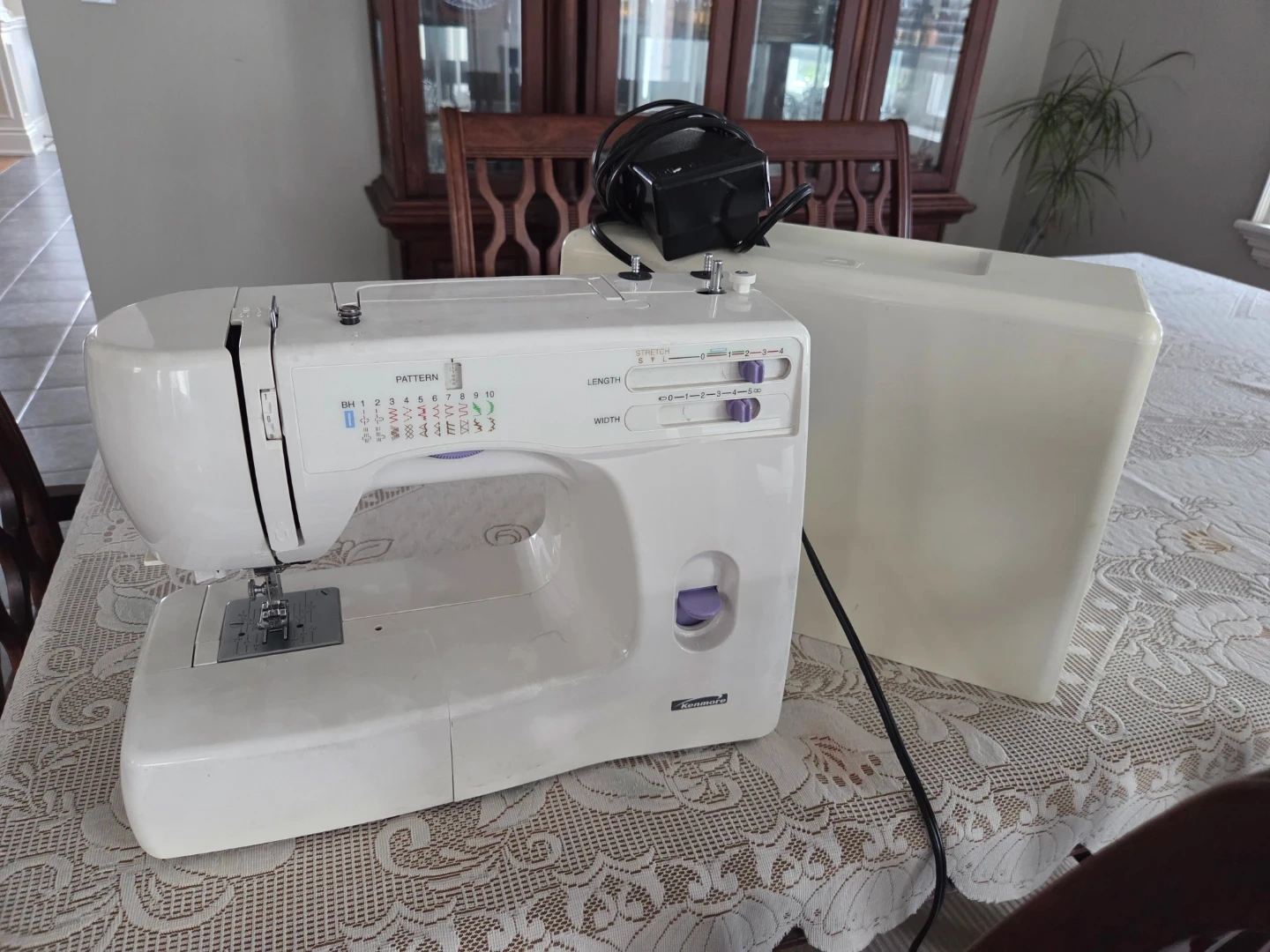 This is a white Kenmore sewing machine. It includes multiple stitch patterns, adjustable length, and width settings. The sewing machine comes with its original cover and power charger