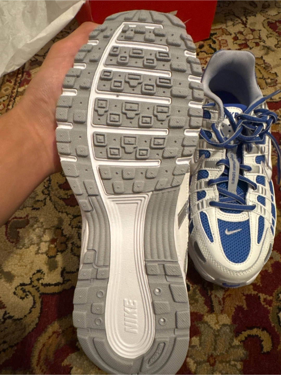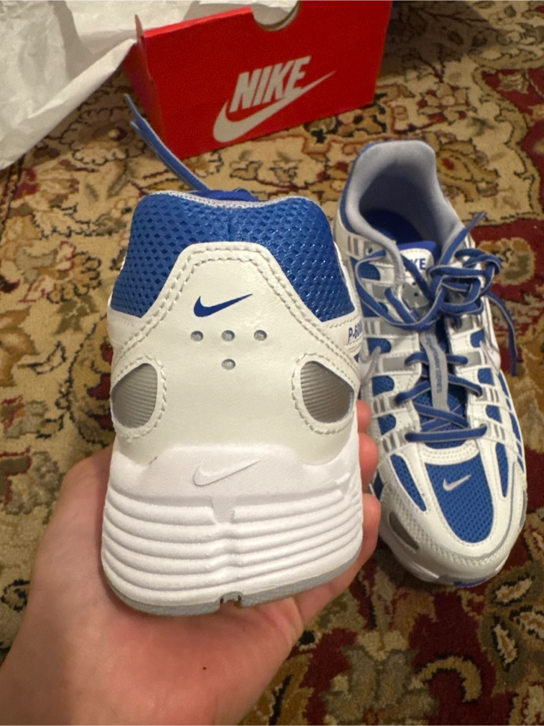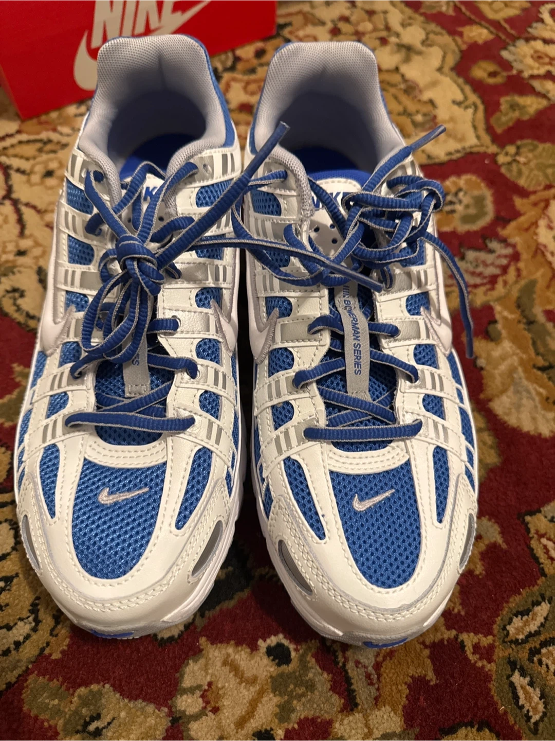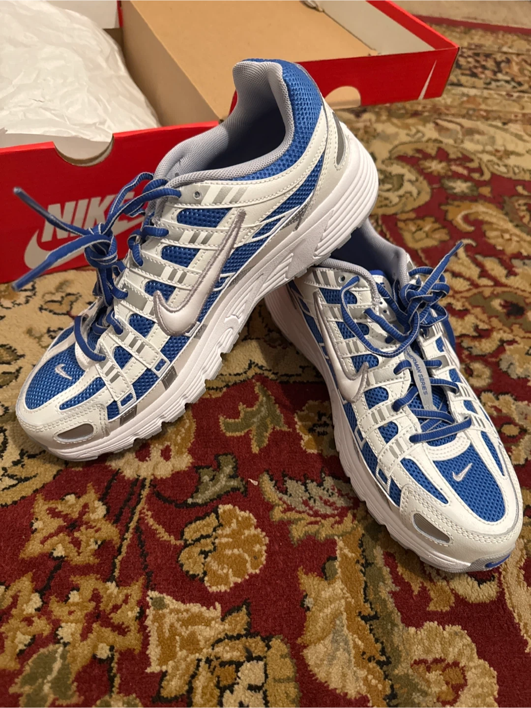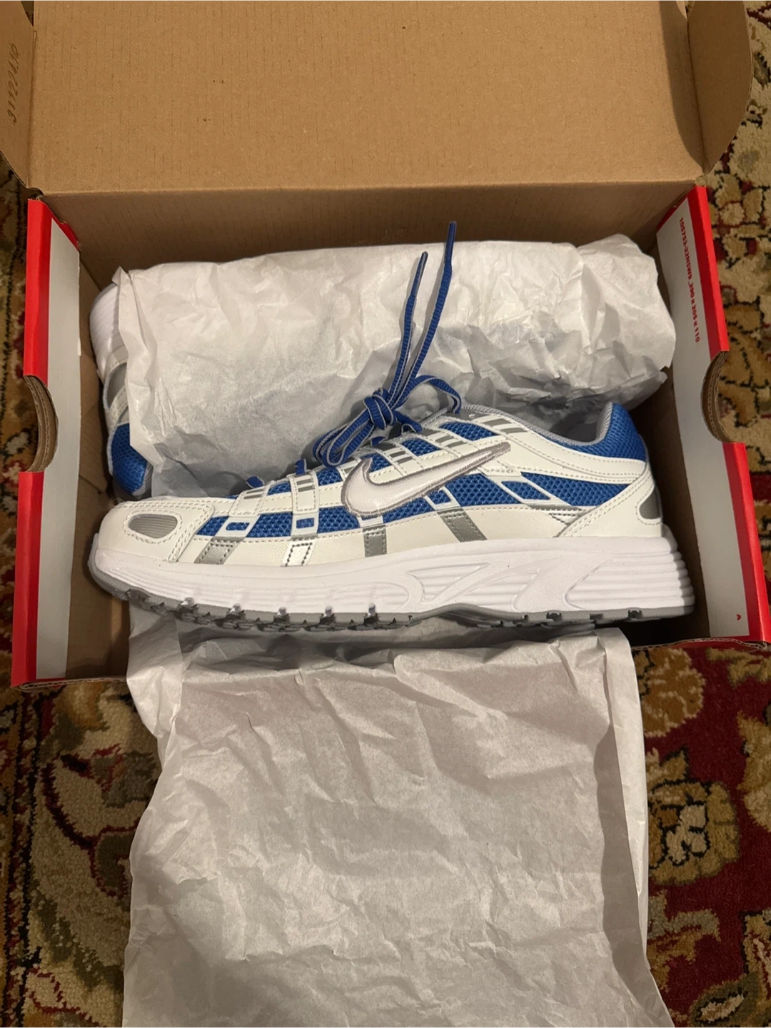 These Nike P-6000 running shoes come in a white, blue, and silver colorway. They feature a breathable mesh and synthetic leather upper. Includes original box and packaging.
