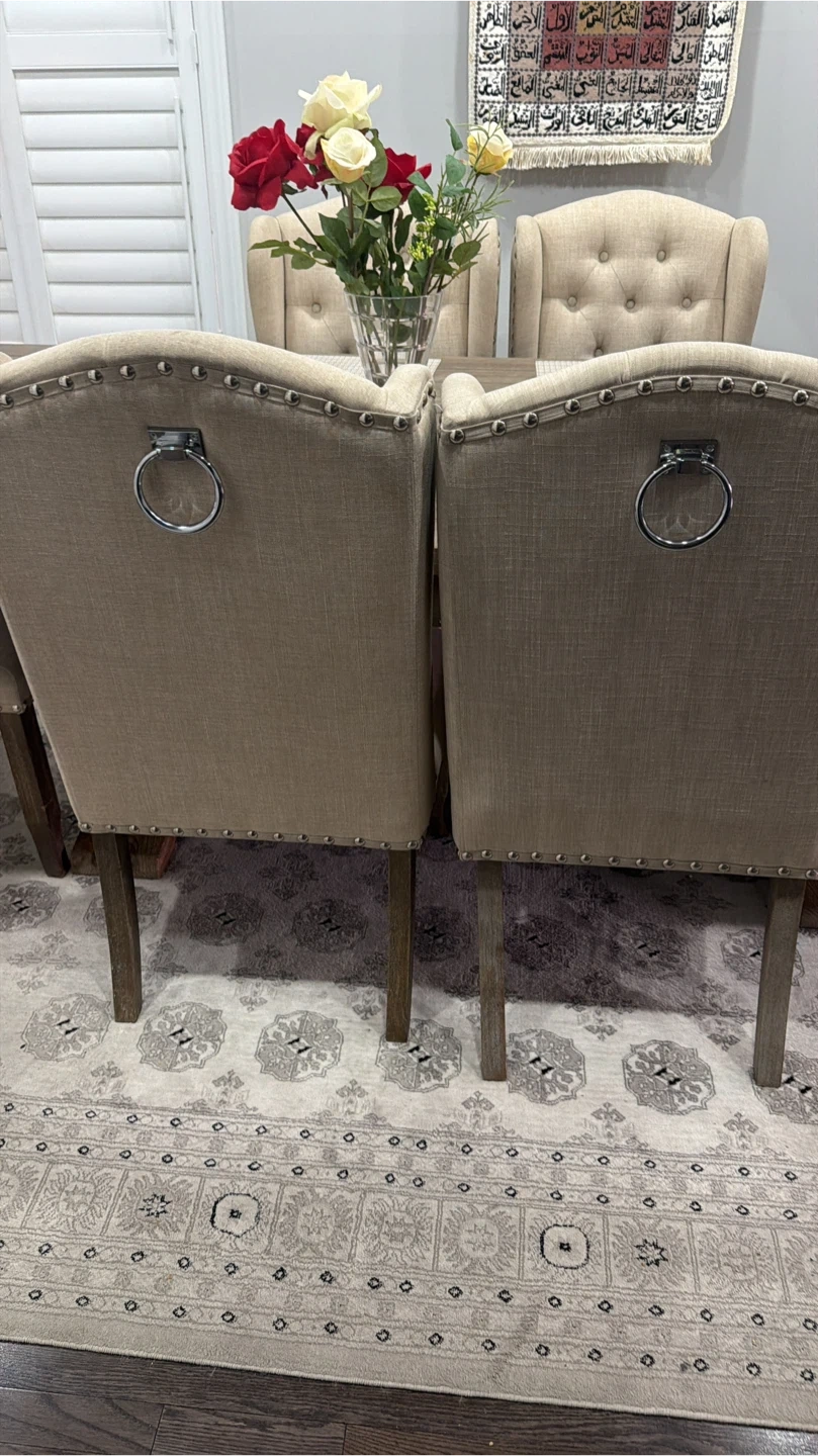 This elegant dining chair features a high tufted back with decorative nailhead trim. It's upholstered in a neutral linen-look fabric with a wooden leg base and a convenient ring pull on the back. Its classic design adds a touch of sophistication to any dining space.