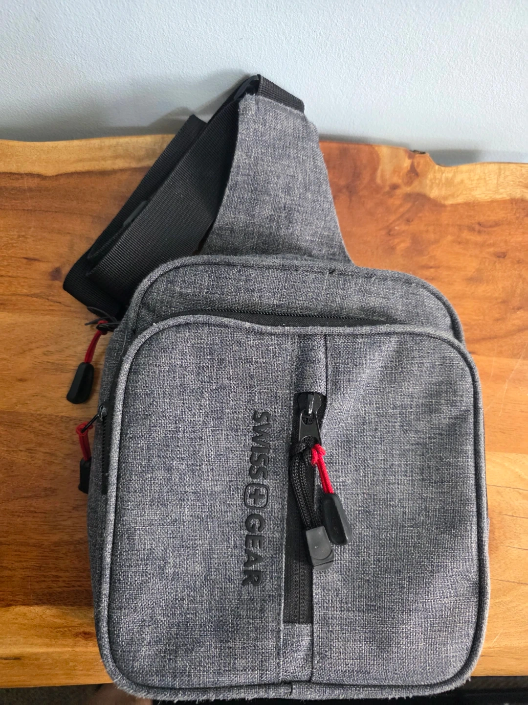 This is a Swiss Gear sling bag in a heather grey colour. It's made from durable fabric. It's great for carrying daily essentials.