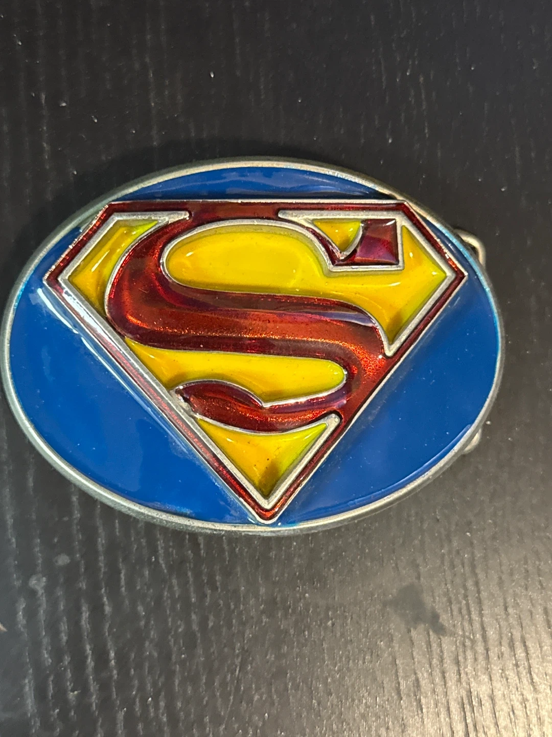 This is a metal belt buckle featuring the classic Superman 'S' logo. It's oval-shaped with a blue border and a red, yellow, and metallic red design. This buckle is a great way to show off your love for Superman!